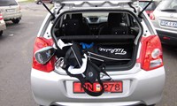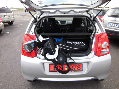 Farangursrýmið er ekki mikið og ef einhver er að hugsa um að nota svona bíl til að fara í golf verður að leggja sætin niður til að koma golfsettinu fyrir. Plássið í farangursrýminu er ekki mikið. Að sitja í framsætunum er mjög gott og fannst mér ótrúlega mikið rými þar fyrir ökumann, það mikið að ég fékk félaga minn sem er vel yfir tveir metrar til að máta undir stýri. Mér til furðu virtist vera ágætis pláss fyrir hann í framsætunum, en í aftursætið þurfti hann að böggla sér inn og sagði að honum fyndist eins og að hann væri í spennitreyju! Hins vegar þegar hann sat í aftursætinu fékk ég þennan fína olnbogapúða sem var hnéð á honum sem kom fram á milli framsætanna.