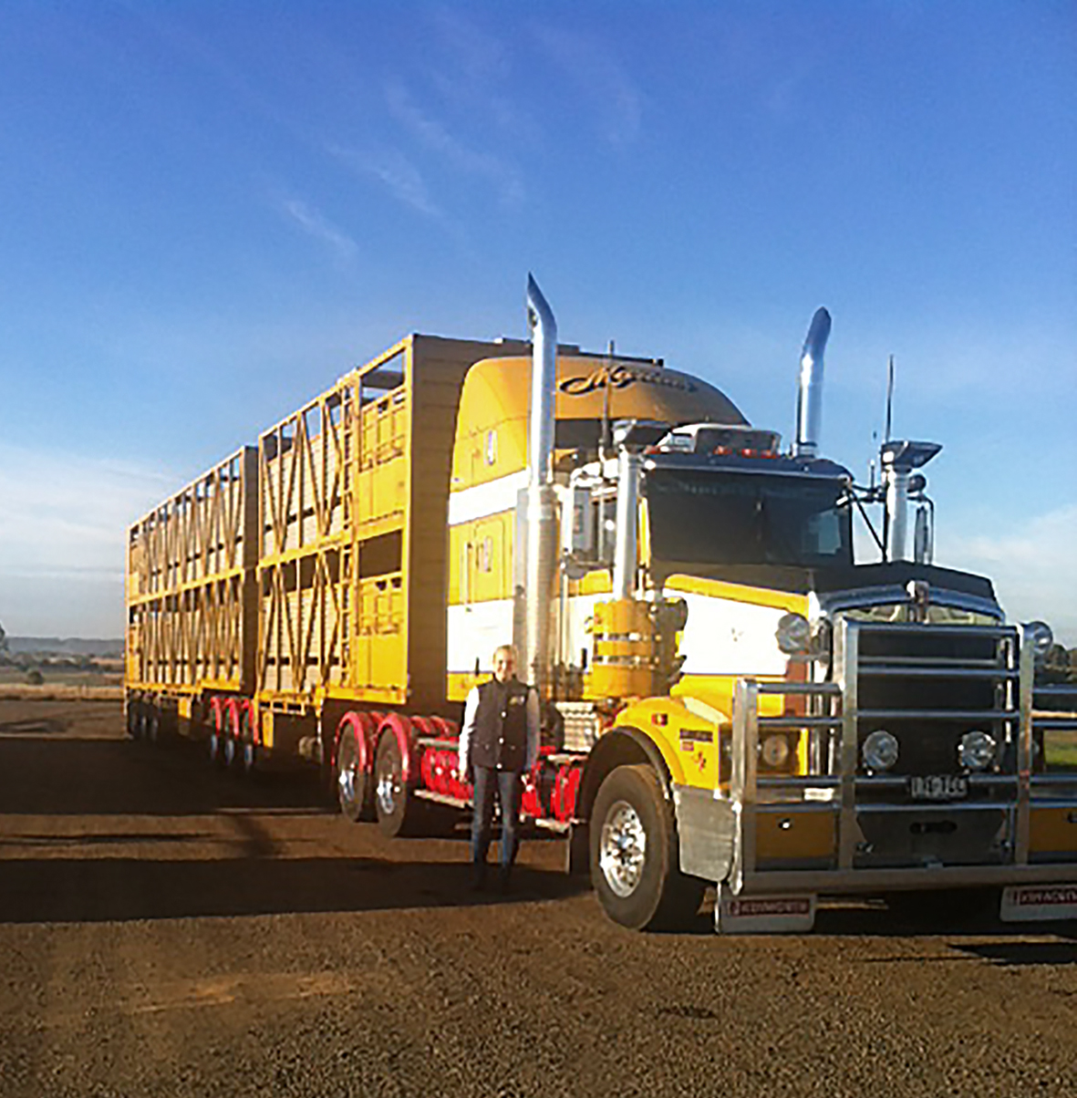 „Stærðirnar hérna á öllu eru svakalegar. Við erum að flytja yfir 300 gripi daglega fyrir suma í sláturhús. Flestir trukkarnir eru svokallaðir B-Double en það er algengasta trukkasamsetningin í Ástralíu fyrir lengri flutninga. Aftan í hvern trukk er hengdur 20 feta vagn að framan og 40 feta vagn að aftan. Slík æki eru leyfð á langflestum vegum. Þegar bílarnir eru ekki að fara í borgir eða á staði með stærðartakmörkum, sem sagt lengra vestur eða norður þaðan sem við erum, þá eru þeir oft B-Triple. Sú samsetning er 20 feta vagn, 20 eða 30 feta vagn og aftast 40 feta vagn. Þegar þeir fara svo enn lengra vestur verða þeir oft „roadtrain“ en þá eru þeir með tvo til þrjá 40 feta vagna og þegar þeir eru fullhlaðnir eru þeir oft að brenna 1 lítra af dísilolíu á hverja 850 metra.