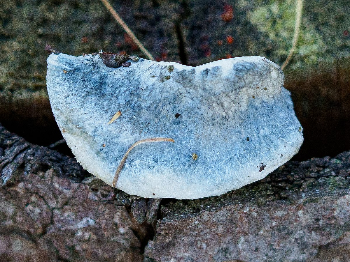 Sjálf hafi hún hvorki verið að eltast við kóngssvepp né kantarellu heldur sé hún, svona með öðru auganu, að fylgjast með útbreiðslu sveppa um landið. „Haustið 2019 fannst til dæmis blábarði, Cyanosporus caesius, brúnfúasveppur sem vex á grenidrumbum og stubbum, fyrst á höfuðborgarsvæðinu. Árið 2020 fannst hann í Skorradal og nú, sumarið 2025, fannst hann í Kjarnaskógi. Gróduft blábarða er blátt sem er afar óvenjulegur litur,“ segir hún.