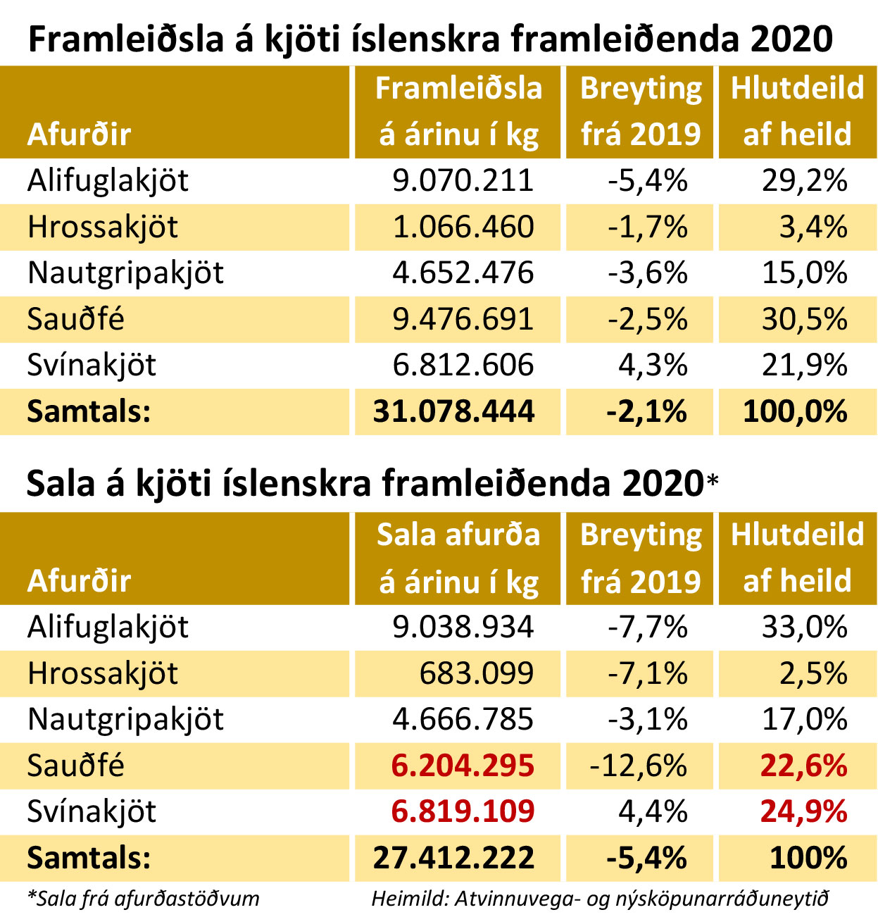 Þótt kindakjötsframleiðslan hafi dregist saman úr rúmum 9.719 tonnum árið 2019 í tæp 9.477 tonn árið 2020, eða um tæp 242,4 tonn, lækkaði hlutfall þess í heildar-framleiðslunni ekki nema um 0,1%, eða úr 30,6 í 30,5%.