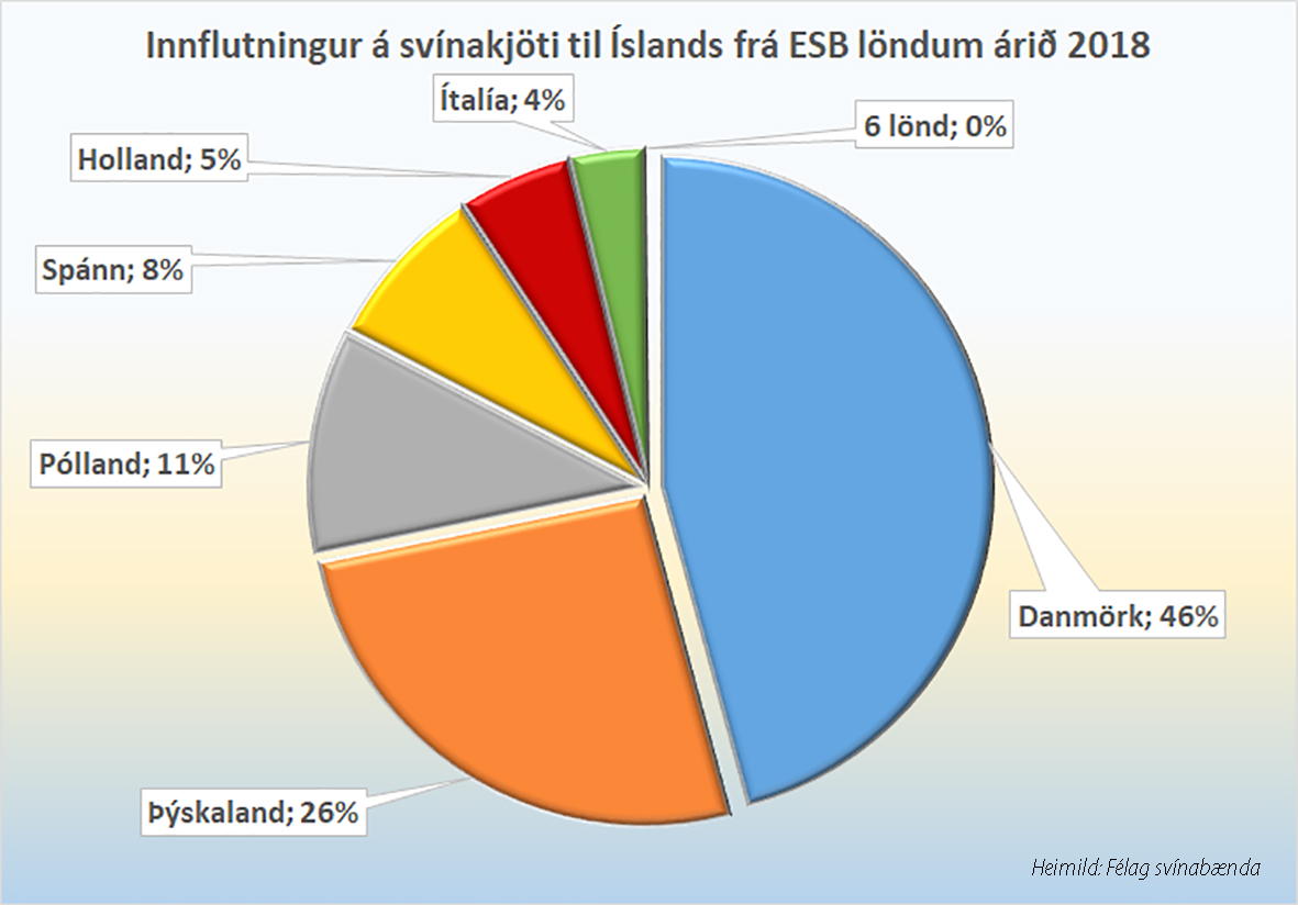 Samkvæmt tölum Hagstofu Íslands voru flutt inn 855 tonn af frosnu svínakjöti á síðasta ári. Langmest af því kjöti var flutt inn frá Danmörku samkvæmt gögnum Félags svínabænda, eða 46%. Næstmest kom frá Þýskalandi og innflutningur frá Póllandi var þar í þriðja sæti.