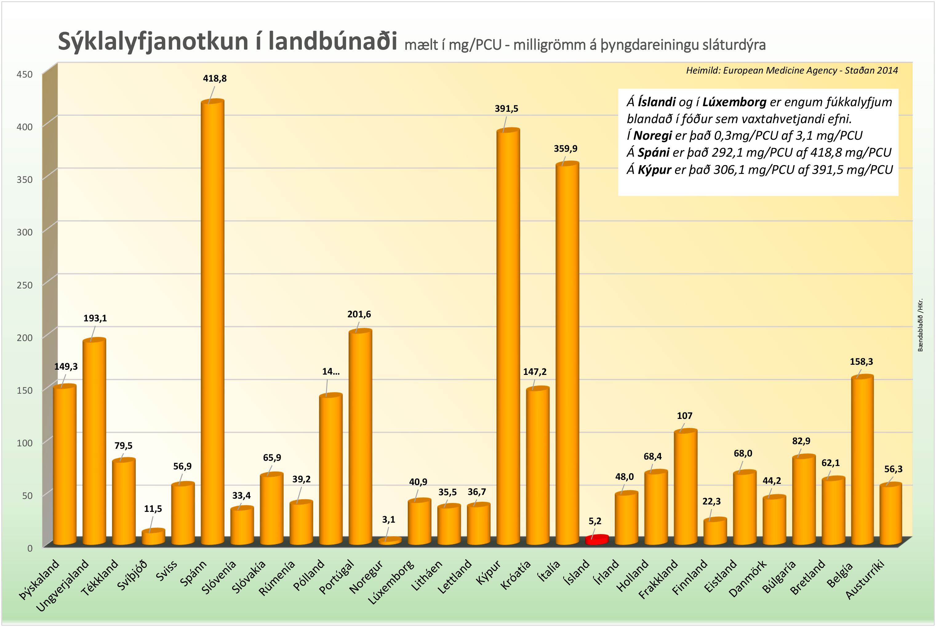 Sem fyrr er notkunin á Íslandi með því langminnsta sem þekkist. Fram kemur í skýrslunni að mest er notkun sýklalyfja í landbúnaði á Spáni. Þar er hún rúmlega 80 sinnum meiri mælt í milligrömmum á þyngdareiningu (mg/PCU) en á Íslandi. Inni í tölunum eru lyf sem blandað er í fóður sem fyrirbyggjandi varnir og sem vaxathvetjandi efni. Á Spáni er nær 70% af sýklalyfjunum blandað í fóður, eða 292,1 mg/PCU af 418,8 mg/PCU heildarmagni. Á Íslandi er talan 0, en 0.9% í Noregi. Langstærsti hluti þess litla sýklalyfjamagns sem hér er notað er beitt ef dýr veikjast og er þá gefið með sprautum í samráði við dýralækna. Það eru 4,5 mg/PCU á meðan Spánverjar eru að nota 17,2 mg/PCU af sprautulyfjum auk gríðarlegs magns annarra lyfjaforma.
