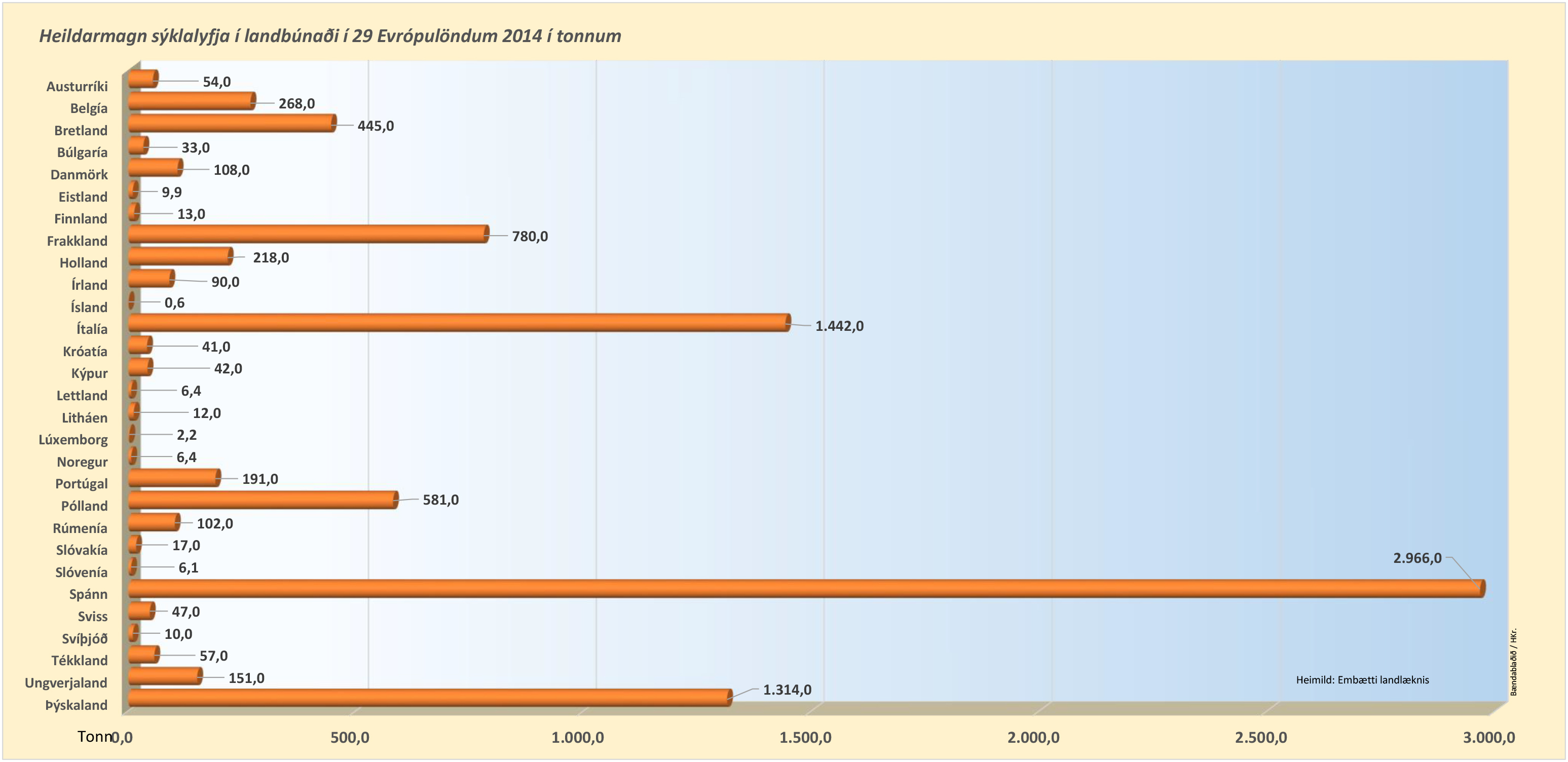 Líkt og fyrri ár var notkun sýklalyfja í dýrum árið 2014 minnst á Íslandi mælt í tonnum. Þegar miðað er við mg/PCU er Ísland þó ekki lengur með minnsta notkun heldur er það Noregur með 3,1 mg/PCU og kemur Ísland þar rétt á eftir með 5,2 mg/PCU. Notkun sýklalyfja handa dýrum er langmest á Kýpur, Ítalíu og Spáni, eða 392, 360 og 419 mg/PCU.