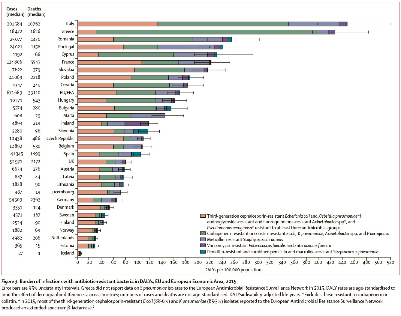 Í nýrri grein í læknatímaritinu Lancet, sem segir frá niðurstöðum rannsóknar sem unnin var fyrir Smitvarnastofnun Evrópu, segir að sýkingar vegna sýklalyfjaónæmra baktería hafi orðið rúmlega 33.000 Evrópubúum að aldurtila árið 2015 þegar rannsóknin var gerð. Í greininni er lýst þeirri hættu sem heimsbyggðin horfir fram á vegna aukinnar tíðni sýkinga af völdum sýklalyfjaónæmis. Talið er að sýklalyfjaónæmar bakteríur muni ógna verulega lýðheilsu í framtíðinni verði ekkert að gert.