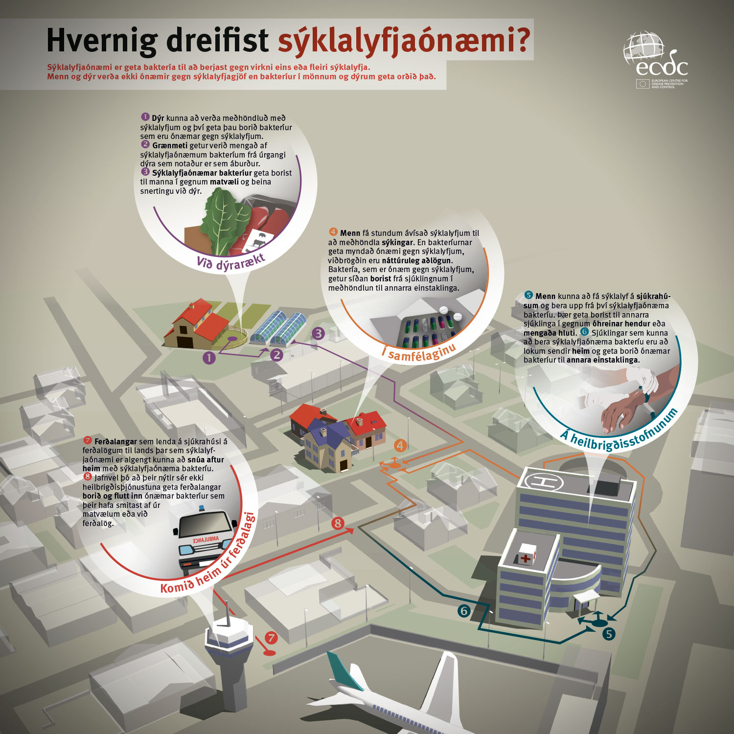 Hvernig dreifist sýklalyfjaónæmi? Skýringarmynd frá Sóttvarnastofnun Evrópu, ECDC