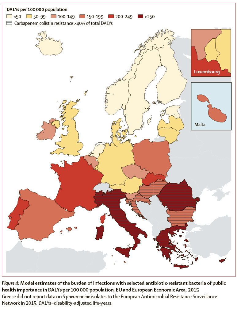 Í niðurstöðum rannsóknarinnar, sem kynntar eru í Lancet, segir að í fyrsta sinn sé reynt að leggja mat á þá byrði, sem fimm gerðir af sýkingum þar sem sýklalyfjaónæmar bakteríur koma við sögu, valda. Lagt er mat á sk. DALYs (e. Disability Adjusted Life Years) sem segja til um fjölda góðra æviára sem glatast vegna heilsufarsvandamála, fötlunar eða ótímabærs dauðdaga. Niðurstöðurnar, sem eru byggðar á mati, segja að umfang sýkinga sem hafi komið upp í ríkjum ESB og EES árið 2015 séu á bilinu 583.000 til 764.000. Þar af megi áætla að 33.110 þeirra hafi leitt til dauða. Sýklalyfjaónæmar bakteríur hafa þannig valdið gríðarlegu heilsutjóni og ýmist stytt eða skaðað líf fólks á svæðinu um 875.000 æviár. Alvarleiki málsins er svo mikill að talið er að það valdi jafn miklu álagi á heilbrigðiskerfið og heilsu fólks á Evrópusvæðinu og inflúensa, berklar og HIV samanlagt.