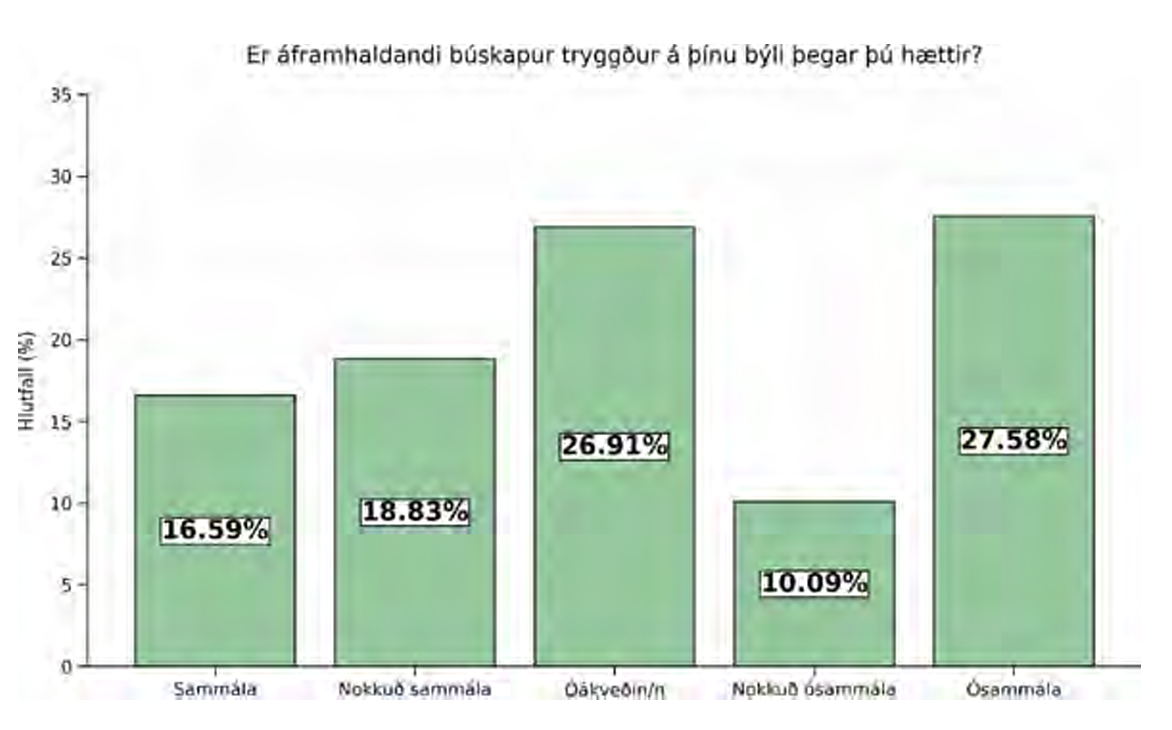 Samkvæmt niðurstöðunum eru 16,59% svarenda sammála því að áframhaldandi búskapur sé tryggður á þeirra býli þegar þeir hætta, og 18,83% segjast nokkuð sammála.
