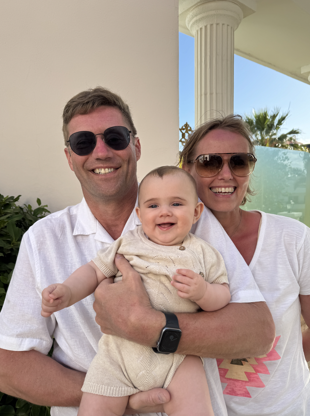 Hjónin Sindri og Anna í suðrænni sælu með barnabarnið Björn Óla Kristjánsson.