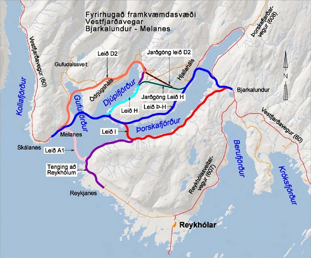 Umrætt svæði við þjóðveg 60 og ýmsar tillögur um lagningu vegar um svæðið á liðnum árum og áratugum. Enn bíða Vestfirðingar með óþreyju eftir að niðurstaða fáist í málið.