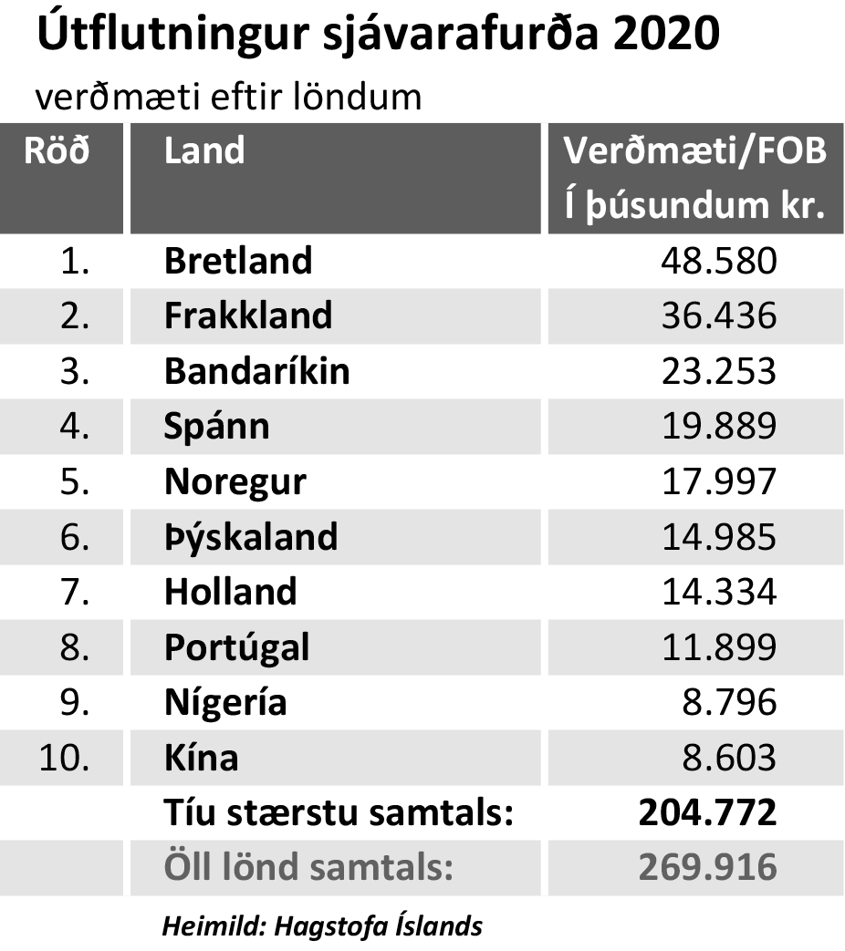Bretar kaupa mest allra þjóða af fiskafurðum frá Íslandi. Útflutningur þangað var um 48,6 milljarðar á síðasta ári sem er um 18% af heildinni. Frakkland kemur þar á eftir með 36,4 milljarða og Bandaríkin eru í þriðja sæti með 23,3 milljarða. Sjá nánar í meðfylgjandi töflu.