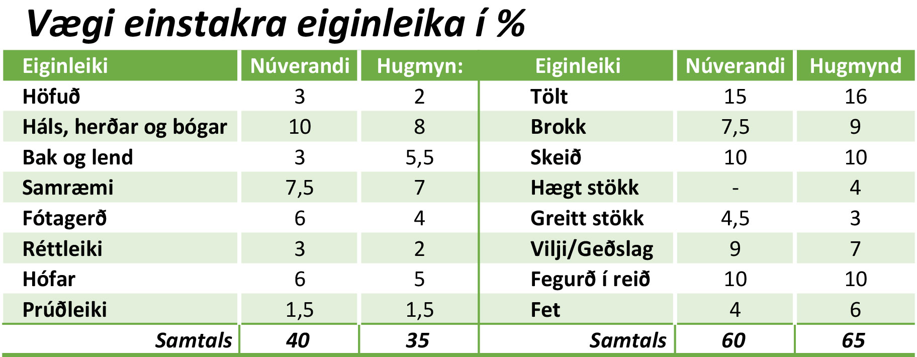 Hugmyndin er að þróa vægistuðla eiginleikanna í aðaleinkunn, þessar breytingar eru hluti af þróun og breytingum á ræktunarmarkmiðinu og dómskalanum sem er verið að vinna að þessa dagana.
