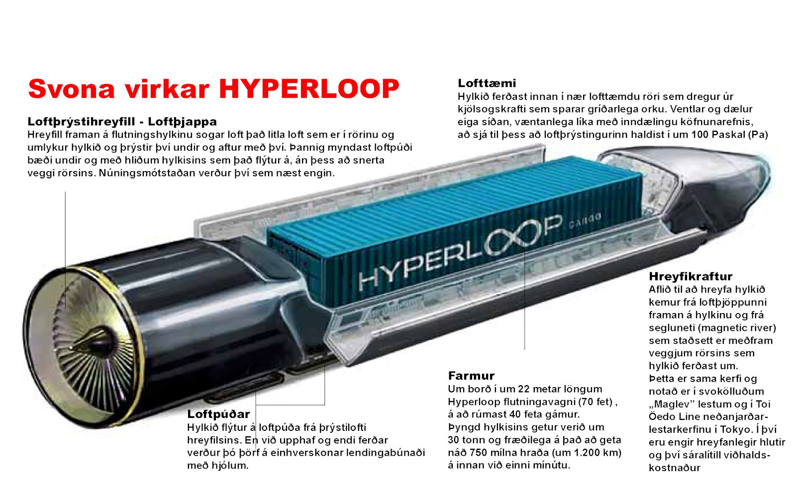 Hugmyndin byggir á því að lestarvagnar togi sig áfram í lokuðum og nær alveg lofttæmdum hólkum með rafknúnum loftþrýstihreyfli og með seglum. Er þá hluti af þrýstiorkunni nýttur í að halda lestinni fljótandi á loftpúða. Þannig rjúfa menn snertimótstöðu lestarinnar við umhverfið sem gerir það mögulegt að auka hröðun hennar gríðarlega og í raun mun hraðar en ef um venjulega þotu væri að ræða. Hugmyndin byggir að hluta til að sömu lögmálum og segul- sviflestirnar sem notaðar hafa verið í Japan.