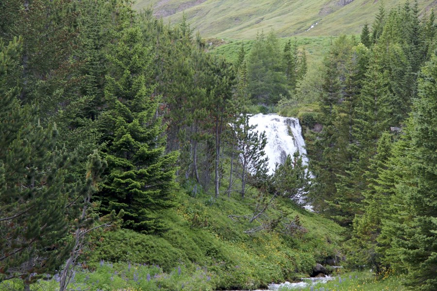 Horft yfir gömlu bogabrúna yfir Fnjóská í Vaglaskóg. Skógur hægir á rennsli vatns til sjávar. Á skóglendu landi tapast næringarefni síður ónýtt til sjávar en skógurinn leysir líka upp kalsín og fleiri efni úr bergi sem nýtast sjávarlífverum m.a. til kolefnisbindingar.