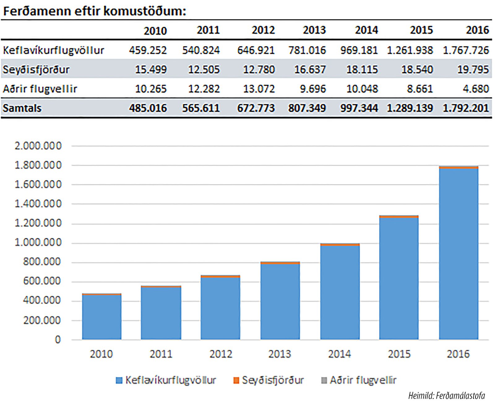 Árið 2012 voru ferðamennirnir tæplega 673 þúsund, rúmlega 807 þúsund árið 2013, rúmlega 997 þúsund árið 2014. Þeir voru orðnir tæplega 1,3 milljónir árið 2015 og tæplega 1,8 milljónir árið 2016. Þá komu nærri 2,2 milljónir ferðamenn til Íslands á árinu 2017 samkvæmt tölum Ferðamálastofu.