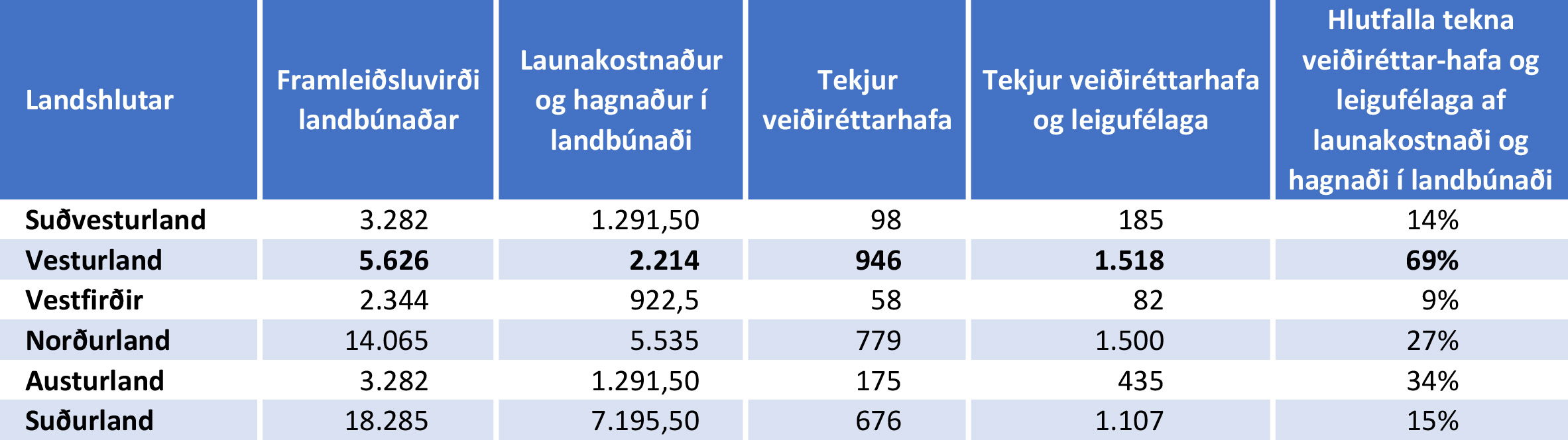 Athygli vekur að þegar skoðað er framleiðsluvirði landbúnaðar í einstökum landshlutum, þá er hlutfall tekna veiðiréttarhafa og leigufélaga af launakostnaði og hagnaði í landbúnaði sláandi miklar í sumum landshlutum. Þannig er hlutfall tekna af lax- og silungsveiði af framleiðsluvirði landbúnaðar á Vesturlandi heil 69%, samkvæmt skýrslu Hagfræðistofnunar HÍ. Þetta hlutfall er næstmest á Austurlandi, eða 34%.