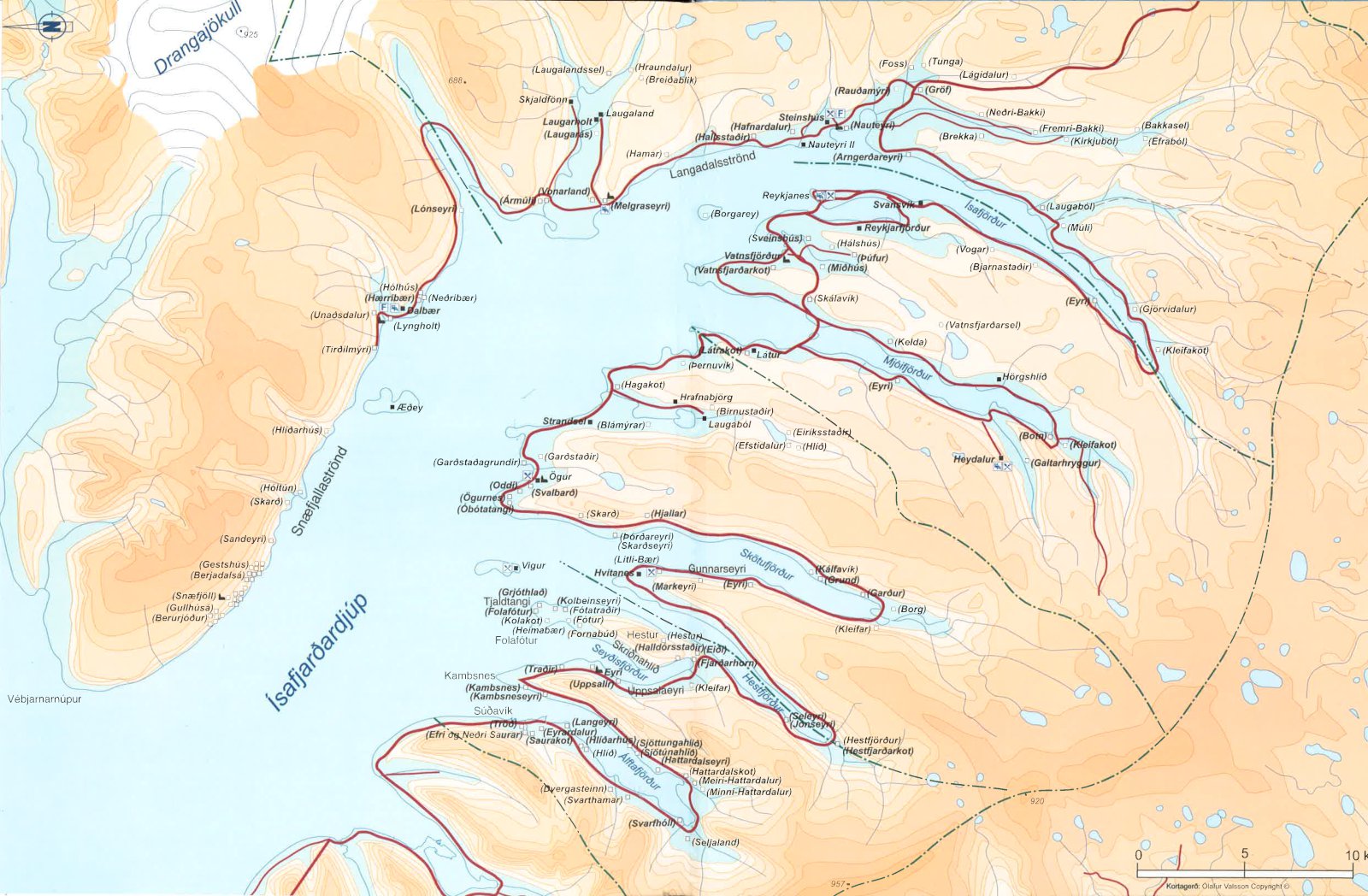 Þá tel ég upp býlin á Ytri-Ströndinni frá 1900 og upp úr því og hverjir bjuggu á þessum bæjum. Um þetta hefur verið talsverður ruglingur í manntölum. Sigurður Sigursveinsson, sem var kennari í Reykjanesi, skrifaði ritgerð um Djúpið og fór um svæðið og studdist þá við loftmyndir og ræddi við móður mína sem bjó sem krakki þarna til ellefu ára aldurs. Hún gat sagt honum hver bjó á hverjum stað. Þannig varð til nokkuð góð lýsing um þá sem þarna bjuggu um aldamótin 1900 og síðan var einnig hægt að styðjast við manntöl. Ég tek þetta upp í bókinni og á það að gefa ágætt yfirlit um hverjir bjuggu þarna. Þarna voru fimm bæir við Gullhúsaá, fimm bæir á Snæfjöllum og níu bæir utan til við Berjadalsána. Innan til við Berjadalsána var býlið Gestshús í Sandeyrarlandi með litlum túnbleðli. Þar hélt fólk samt tvær kýr.“