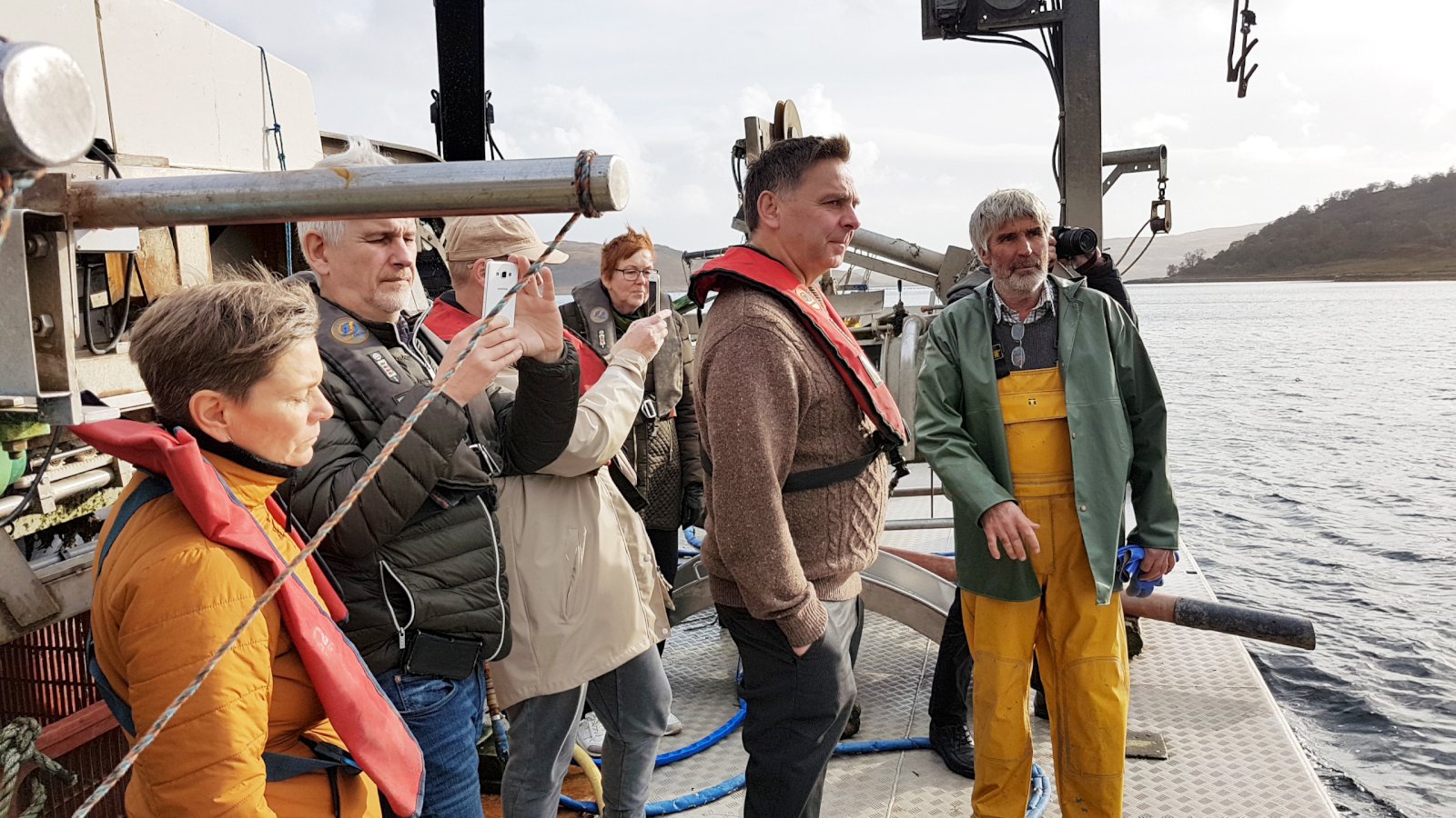 Úti á pramma að skoða kræklingarækt, en kræklingaeldi er stundað við eyna Mull í Skotlandi.