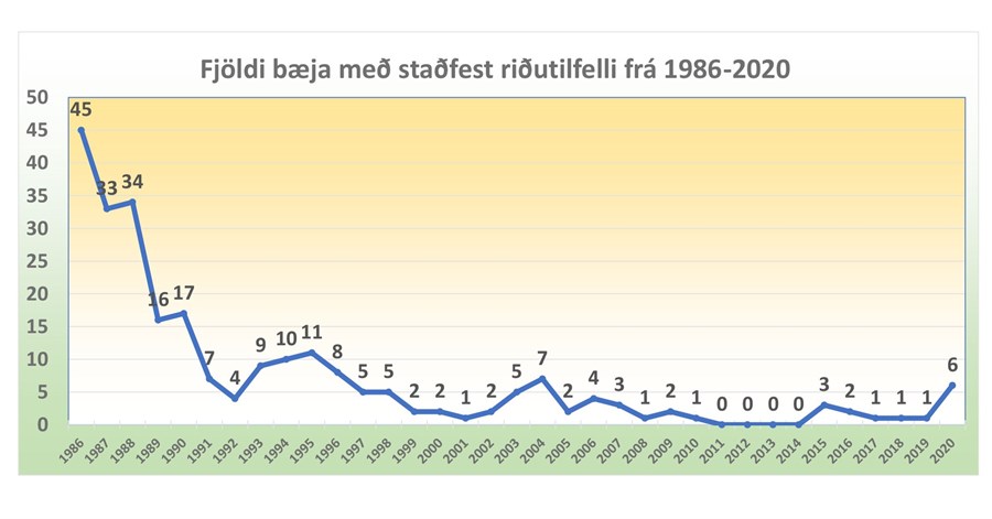 Til eru gögn aftur til ársins 1957 um riðutilfelli sem komið hafa upp hérlendis. Samkvæmt Sigrúnu Bjarnadóttur, sérgreinadýralækni nautgripa- og sauðfjársjúkdóma hjá Matvælastofnun Íslands er þó erfitt að treysta á þau gögn vegna ýmissa vankanta. Í dag er að mestu stuðst við tölur frá árinu 1986 sem sýna svo ekki verður um villst að verulegur árangur hefur náðst í baráttunni við sjúkdóminn frá þeim tíma.