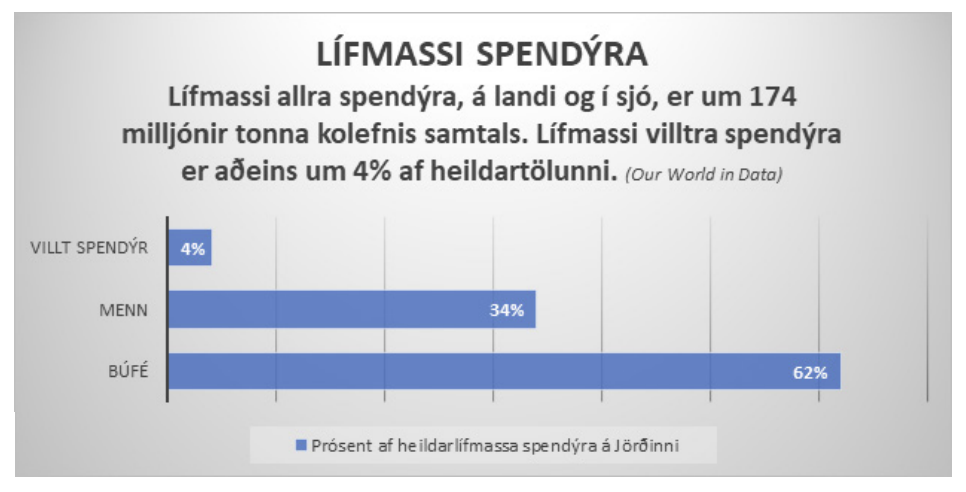 Yfirburðir manna séu augljósir. Maðurinn er með um þriðjung af lífmassa spendýra. Næstum tíu sinnum meira en villt spendýr. Búfjárstofn manna er tæplega tveir þriðju hlutar.