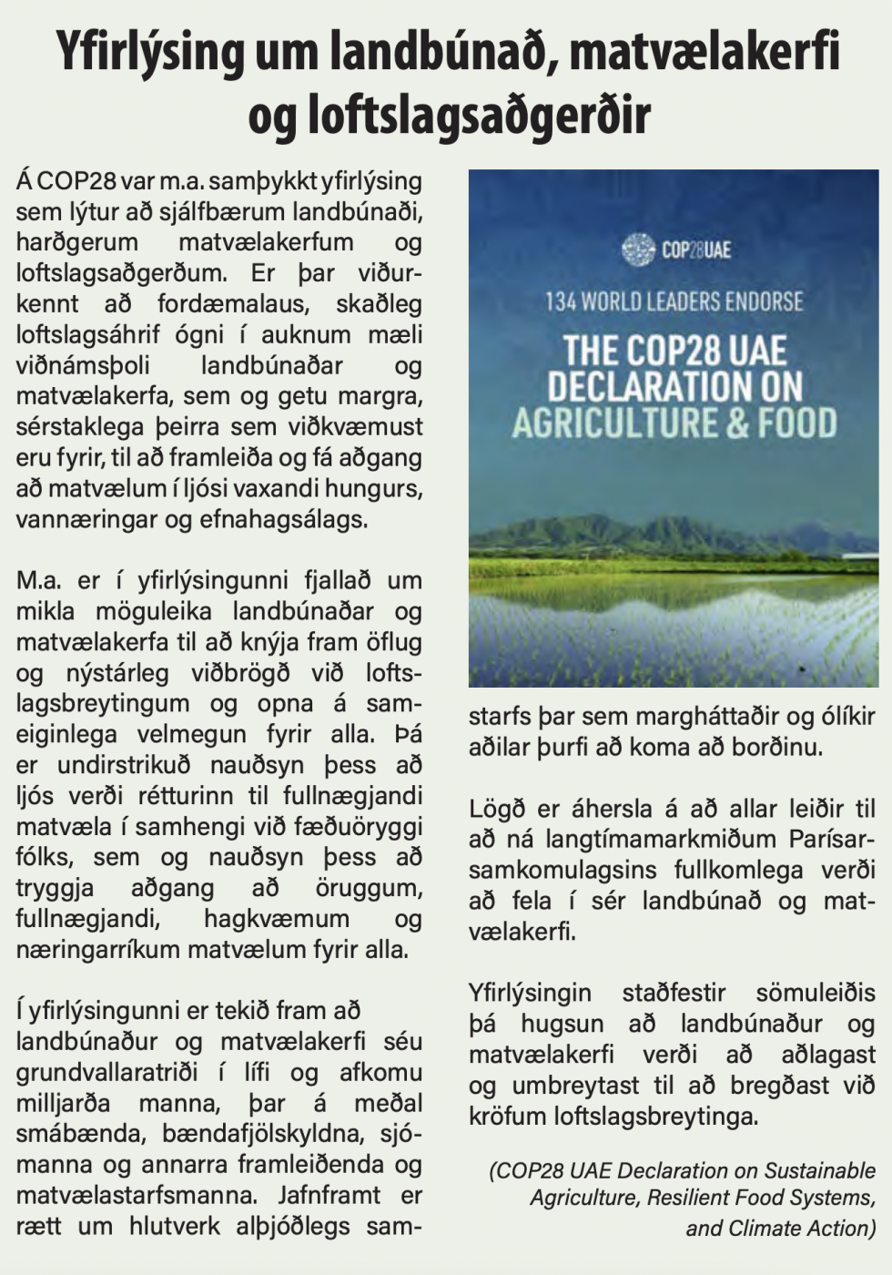 Segja má að á COP28 hafi í fyrsta sinn verið varpað ljósi á mikilvægi matvælakerfa og landbúnaðar í loftslagsaðgerðum.