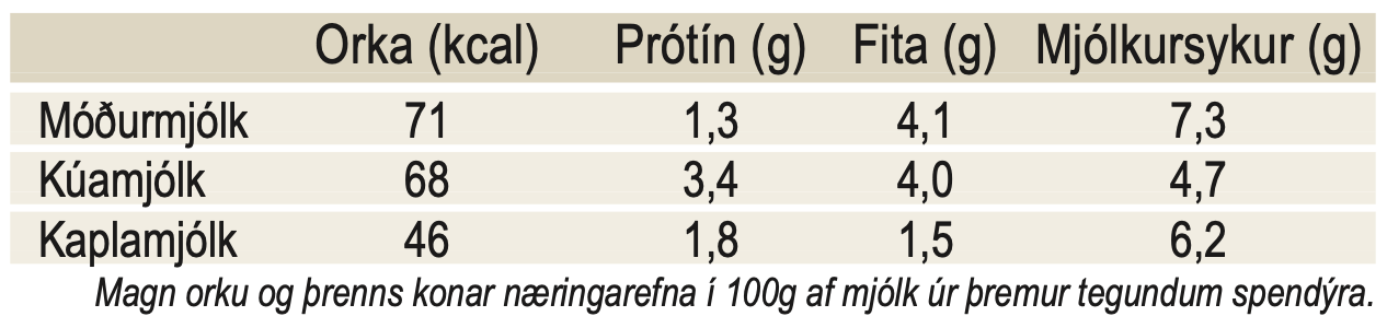 Tafla um næringarinnihald kúa-, kapla- og móðurmjólkur. Tafla / Vísindavefurinn