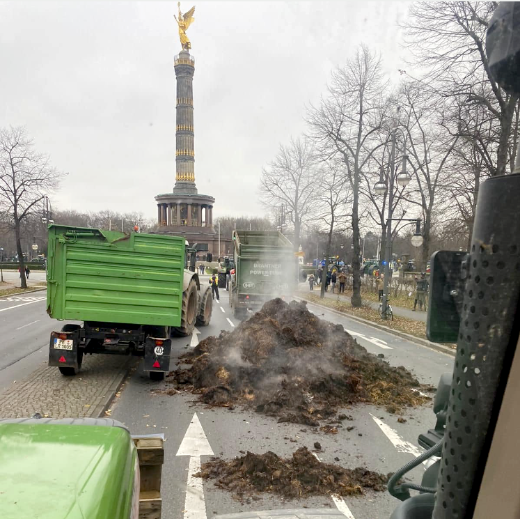 Þýskir bændur hafa að undanförnu mótmælt áformum stjórnvalda um að draga úr niðurgreiðslum á dísilolíu og skattaívilnunum fyrir landbúnaðartæki með því að hefta umferð á hraðbrautum og dreifa skít í þéttbýli.