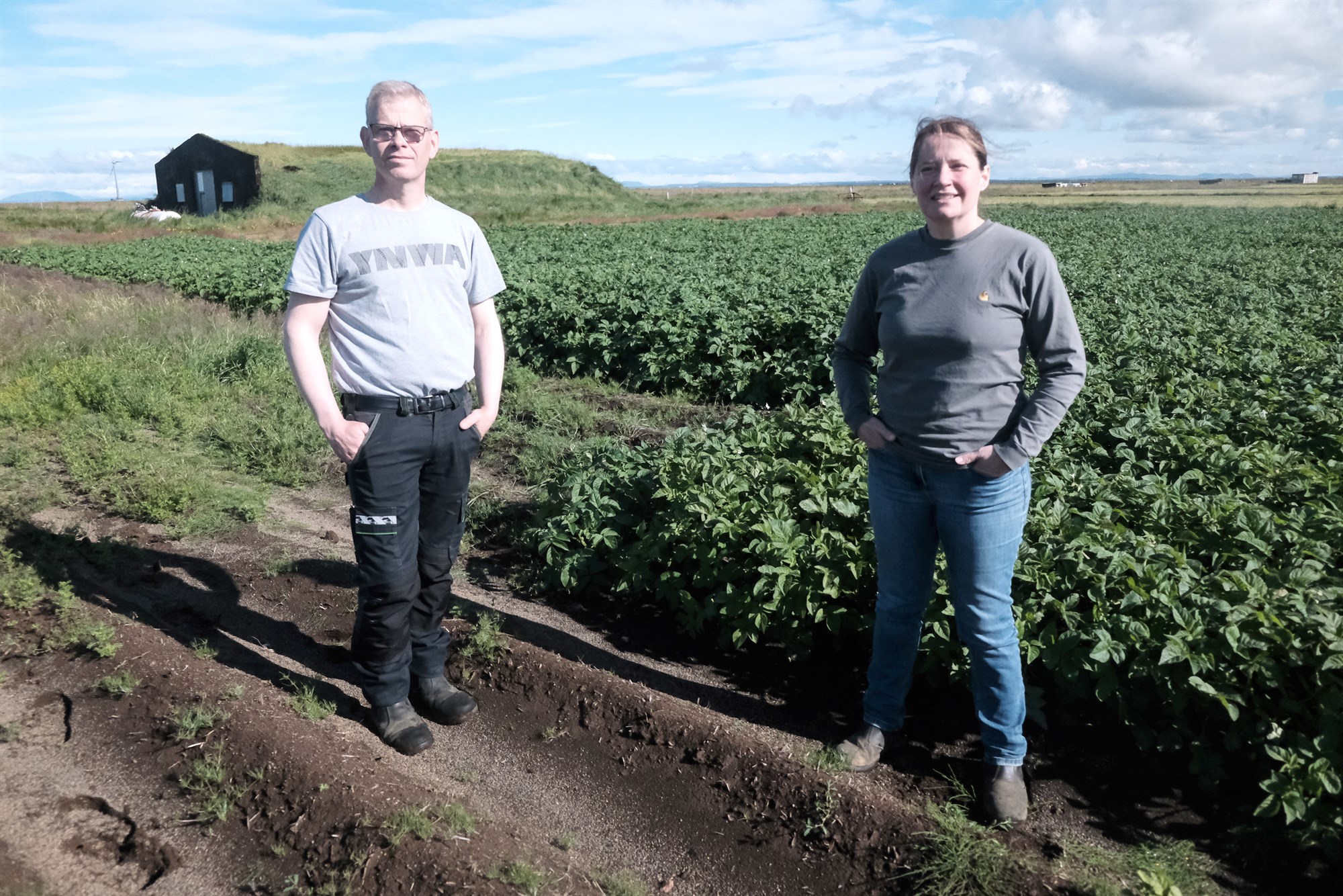 Guðni og Lilja eru hér í kartöflugarði í Háarima, þar sem Guðni ólst upp. Þau eru með lönd þar einnig undir sína ræktun.