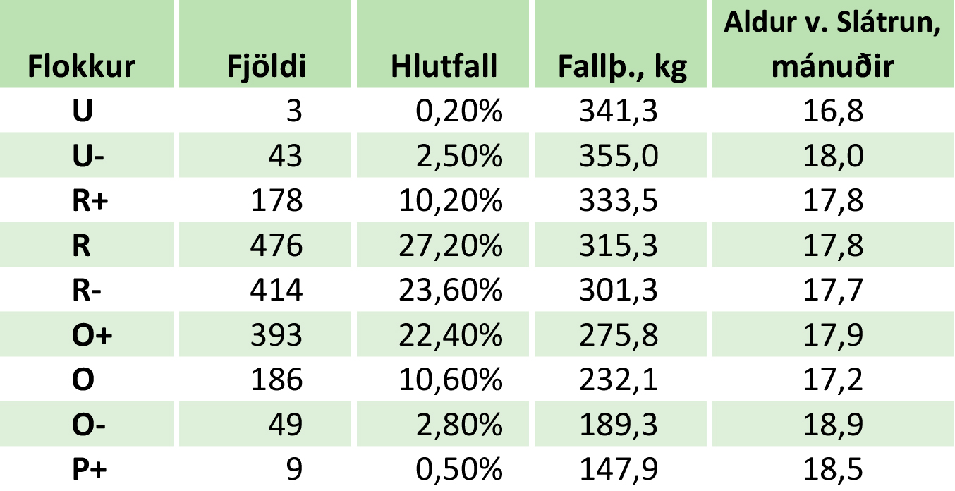 Nánar má sjá dreifingu flokkunarinnar á myndinni og töflunni hér til hliðar; bestu föllin fara í U flokk en þau lökustu í P+.