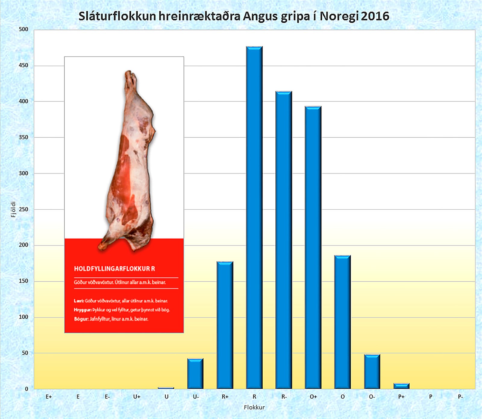 Árið 2016 komu 1.751 hreinræktuð ungnaut af Angus til slátrunar í Noregi, skv. tölum frá Animalia. Um 60% gripanna flokkuðust í R+, R og R-, meðal fallþungi var 292 kg og að jafnaði voru þeir 17,8 mánaða gamlir við slátrun.