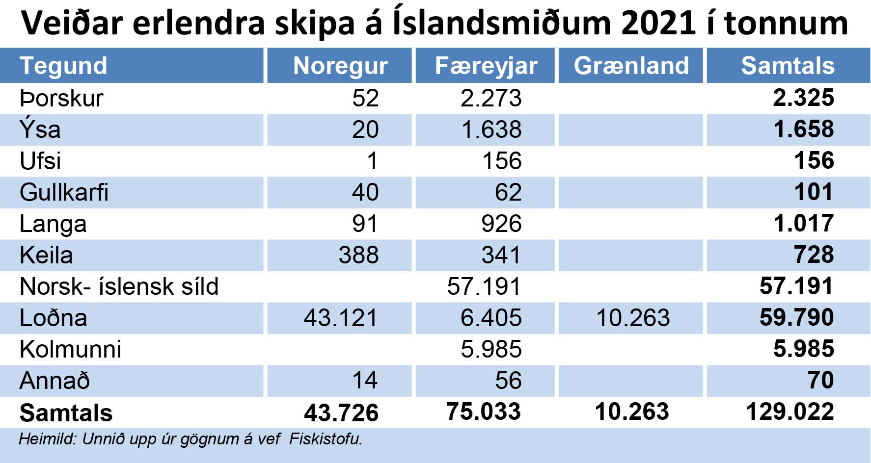 Erlend skip veiddu hér nánar tiltekið 129.022 tonn, miðað við tölur sem unnar eru upp úr gögnum á vef Fiskistofu. Til samanburðar má geta þess að heildarafli íslenskra skipa var tæpar 1,2 milljónir tonna á árinu 2021, samkvæmt bráðabirgðatölum Fiskistofu.