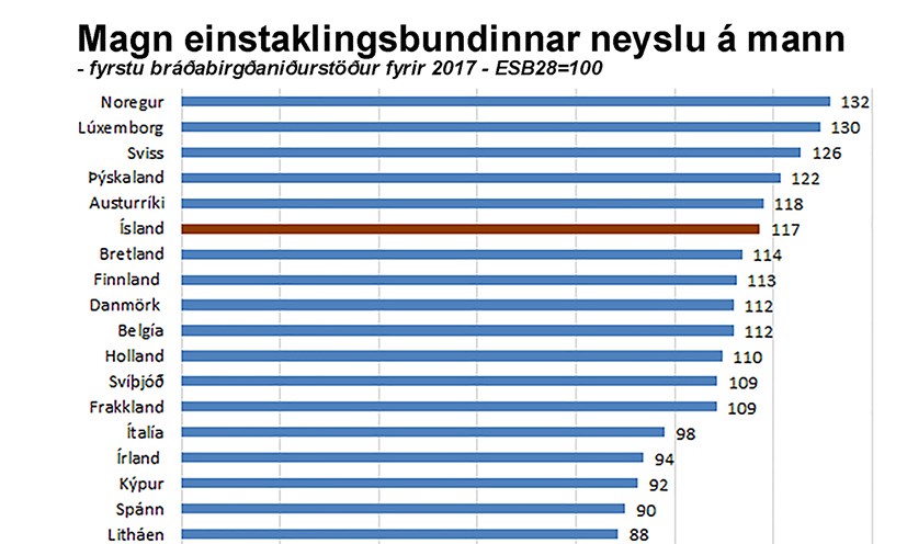 Þá kemur fram í úttekt Eurostat að neysla er mjög breytileg milli þjóða í Evrópu. Þar eru íslenskir neytendur með 17% meiri neyslu en að meðaltali í 28 ESB-ríkjum. Langmesta neyslan er í Noregi, eða 32% yfir meðaltali ESB-ríkja. Þá kemur Lúxemborg, eða 30% yfir meðaltali. Sviss er með 26% yfir meðaltali, síðan kemur Þýskaland með 22%, þá Austurríki með 18% yfir meðaltali. Ísland er svo með sjöttu mestu neyslu á mann af 37 Evrópuríkjum, eða eins og fyrr segir 17% yfir meðaltali.