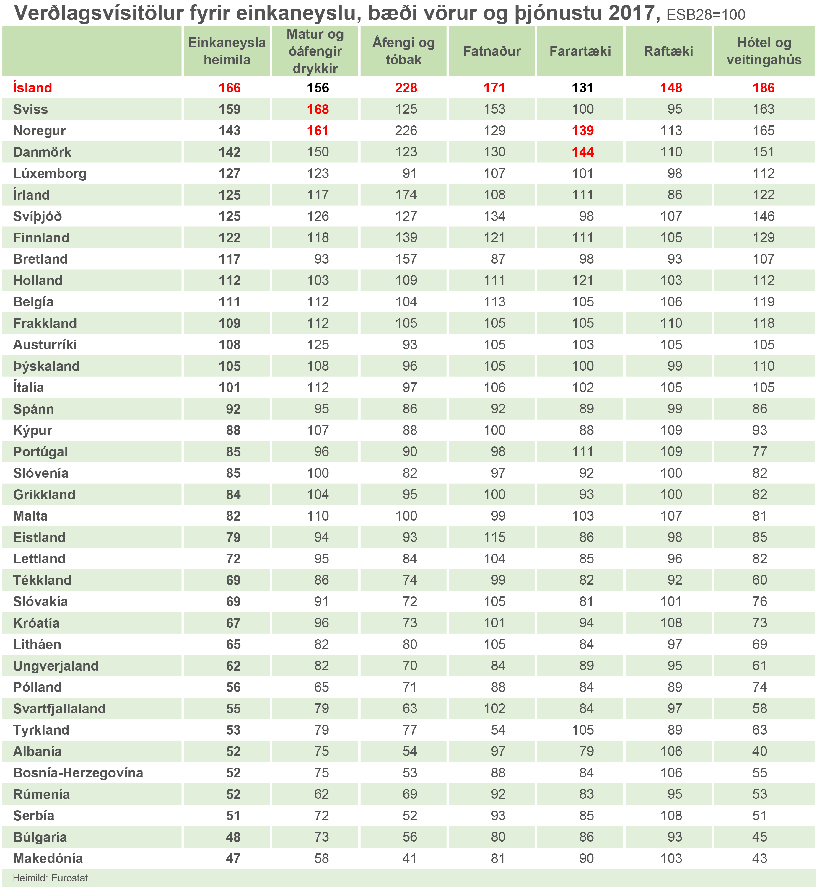 Verðlag einkaneyslu heimila í 37 Evrópuríkjum sem Eurostat hefur tekið til skoðunar var hæst á Íslandi árið 2017. Það var 66% yfir meðaltali ESB28.