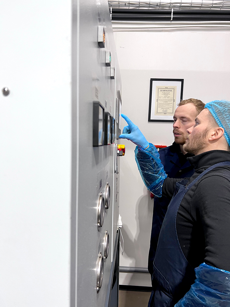 Ingimar Rafn Ágústsson frá VAXA Technologies og Sigurður Steinar lesa af mælum þurrkarans.