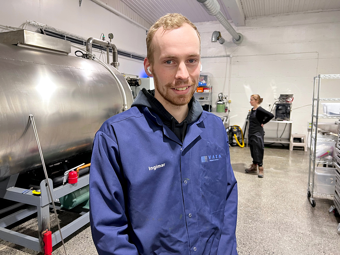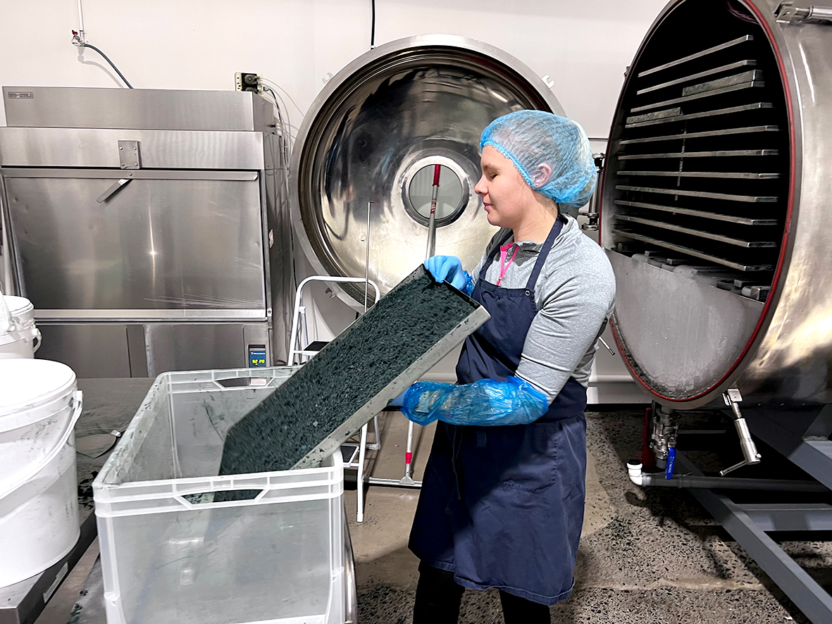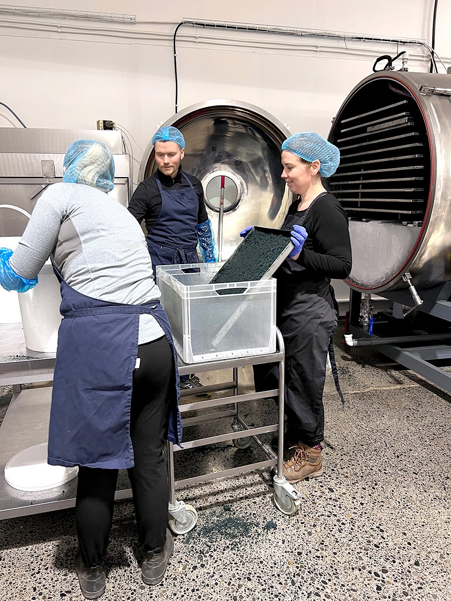 Þegar blaðamaður var á ferð hjá Frostþurrkun í Þorlákshöfn var starfsmaður frá fyrirtækinu Vaxa Technologies að taka á móti frost þurrkuðum smáþörungum, sem framleiddir eru við Hellisheiðar virkjun. „Þetta eru spirulina þör ungar, örsmáir blágrænir þörungar sem við erum að láta þurrka fyrir okkur,“ segir Ingimar Rafn Ágústs son. „Mest af þessari framleiðslu sem við erum að þurrka hér fer til Bandaríkjanna. Þar erum við að klára að græja vinnslulínu sem snýst um að ná þessum tæra nát túrulega bláa lit og þá erum við komin með þetta eftirsótta nát túrulega litarefni. Það gengur vel og erum við á lokametrunum þar áður en við sendum græjurnar hin gað í Þorlákshöfn þar sem við æt lum að setja upp vinnsluaðstöðu,“ bætir Ingimar við.