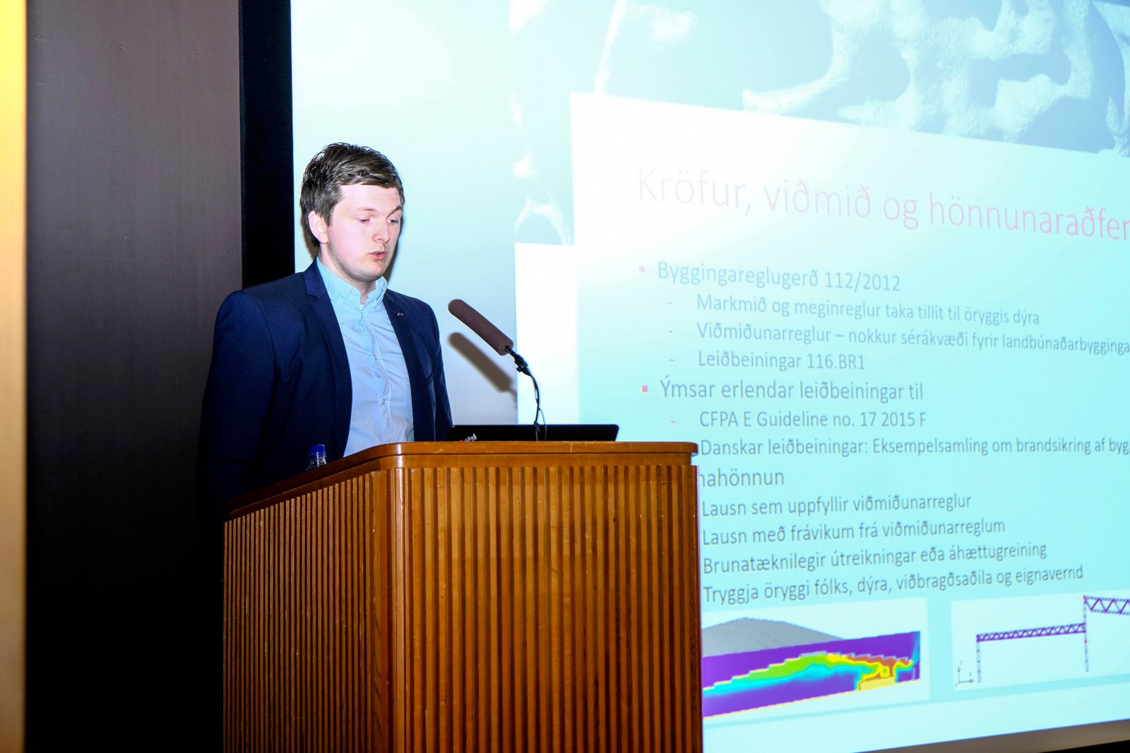 Atli Rútur Þorsteinsson, verkfræðingur hjá Eflu, fjallaði um brunahönnun landbúnaðarbygginga í erindi sínu. Þar kom fram að markmið og meginreglur byggingareglugerðar númer 112 frá 2012 taki tillit til öryggis dýra. Nokkrar sérreglur, eða viðmiðunarreglur, gildi sérstaklega fyrir landbúnaðarbyggingar. Við brunahönnun sé einnig hægt að taka mið af leiðbeiningum Mannvirkjastofnunar og ýmsum erlendum leiðbeiningum.