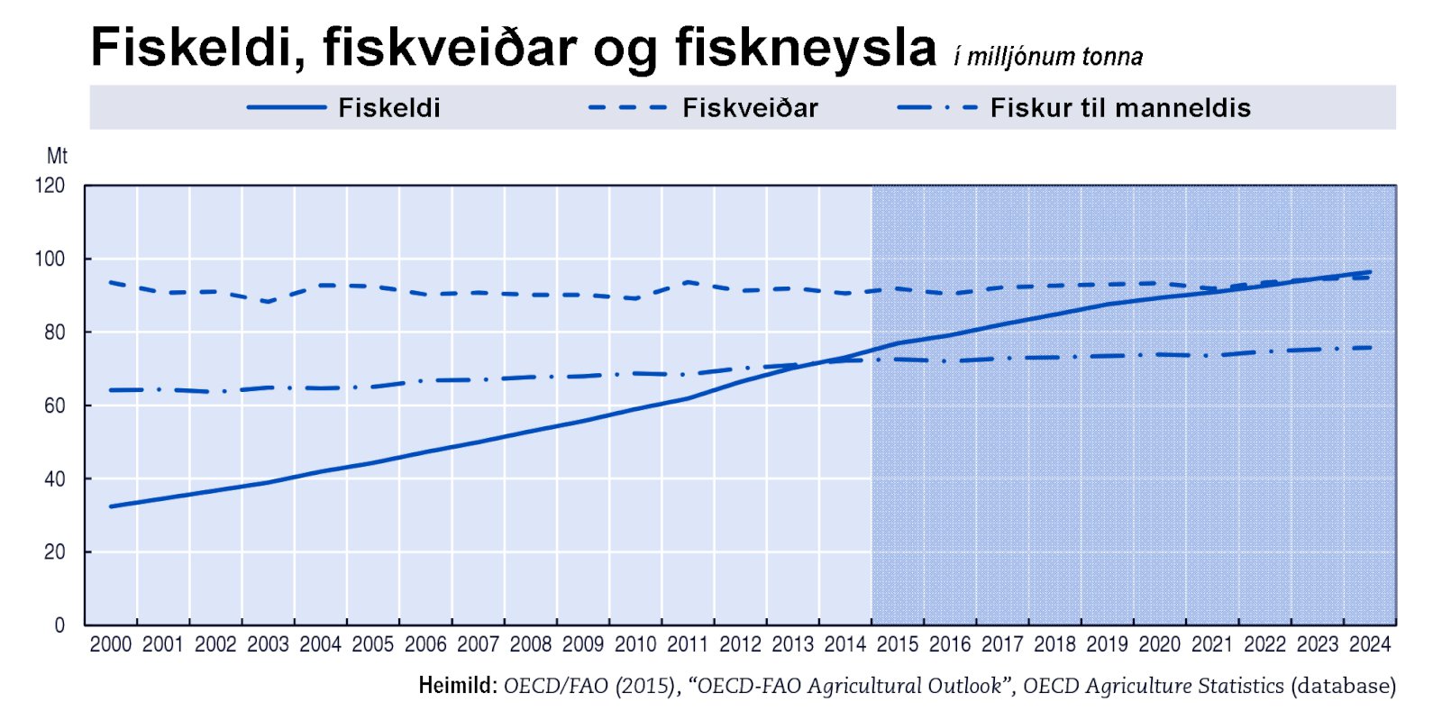 Neysla á fiski úr fiskeldi fór fram úr neyslu á villtum fiski í magni talið á heimsvísu á árinu 2014. Hafa ber í huga að umtalsvert magn af fiski er nýtt til fóðurgerðar fyrir dýraeldi sem OECD og FAO telja mikilvægt til að viðhalda fæðuöryggi í löndum heims. Framleiðsla á fiskimjöli í heiminum verður nokkuð stöðug, eða um 5 milljónir tonna árið 2024, og framleiðsla á lýsi mun nema um 1 milljón tonna samkvæmt spám.