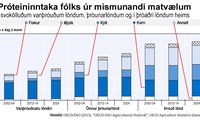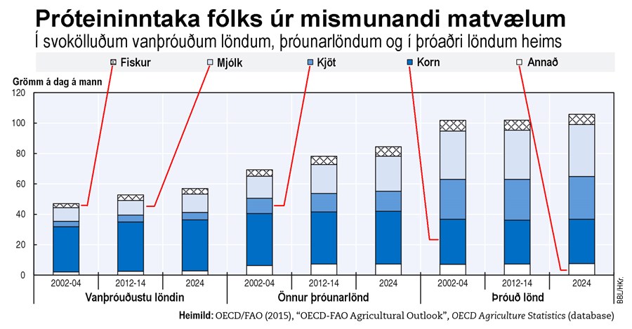Samhliða aukinni heildarframleiðslu landbúnaðarafurða á heimsvísu mun neysla aukast að meðaltali úr 34,1 kg í 35,5 kg á mann. Athygli vekur að kjötneysla í þróaðri löndum er ríflega tvöföld miðað við meðaltalsneysluna í svokölluðum þróunarlöndum. Þannig er neyslan á mann í þróaðri ríkjum heims um 65 kílógrömm á mann í dag en verða, miðað við spá OECD og FAO, 67,6 kg á mann árið 2024. Í OECD-ríkjunum er þetta mjög svipað. Þar er kjötneyslan 65,4 kg árið 2016 og 67,3 kg árið 2024. Í þróunarríkjunum er meðaltalsneyslan nú um 26,8 kg en spáð er að hún aukist um tæplega tvö kíló á mann fram til 2024 og fari í 28,5 kg. Tekið er sérstaklega fram í skýrslunni að Ísland er ekki inni í þessari spá.