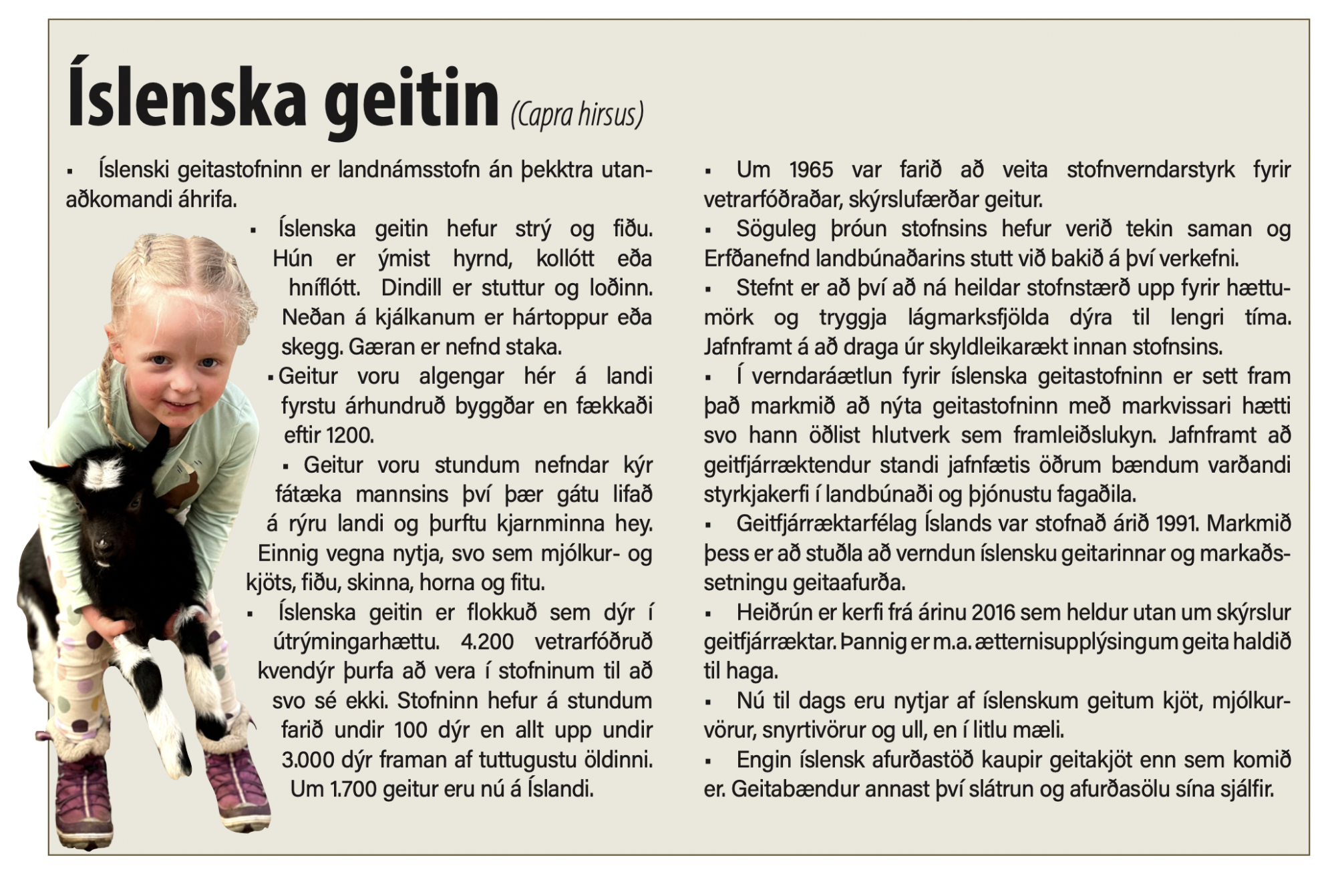 „Síðan þá hafa geiturnar verið hjá okkur og Björgólfur tuðað mismikið yfir þeim en samt geri ég ekki annað en að ná myndum af honum vera að knúsast í henni Gæfu, að greiða á henni hökutoppinn og ég veit ekki hvað,“ segir Agnes hlæjandi. „Þegar ég fór að tala um að gera almennilegt svæði fyrir þær og benti á neðsta hornið í fjárhúsunum, sagði hann: „Já, það væri nú alveg hægt að hafa einhverjar tíu geitur þarna.“ Svo hann er ekki svo ósáttur við þær. Ef þið spyrjið hann eru þetta voðalega pirrandi dýr en svo fer hann að tala um hvað geiturnar séu nú skemmtilegar inn á milli!“ segir Agnes, létt í tali.
