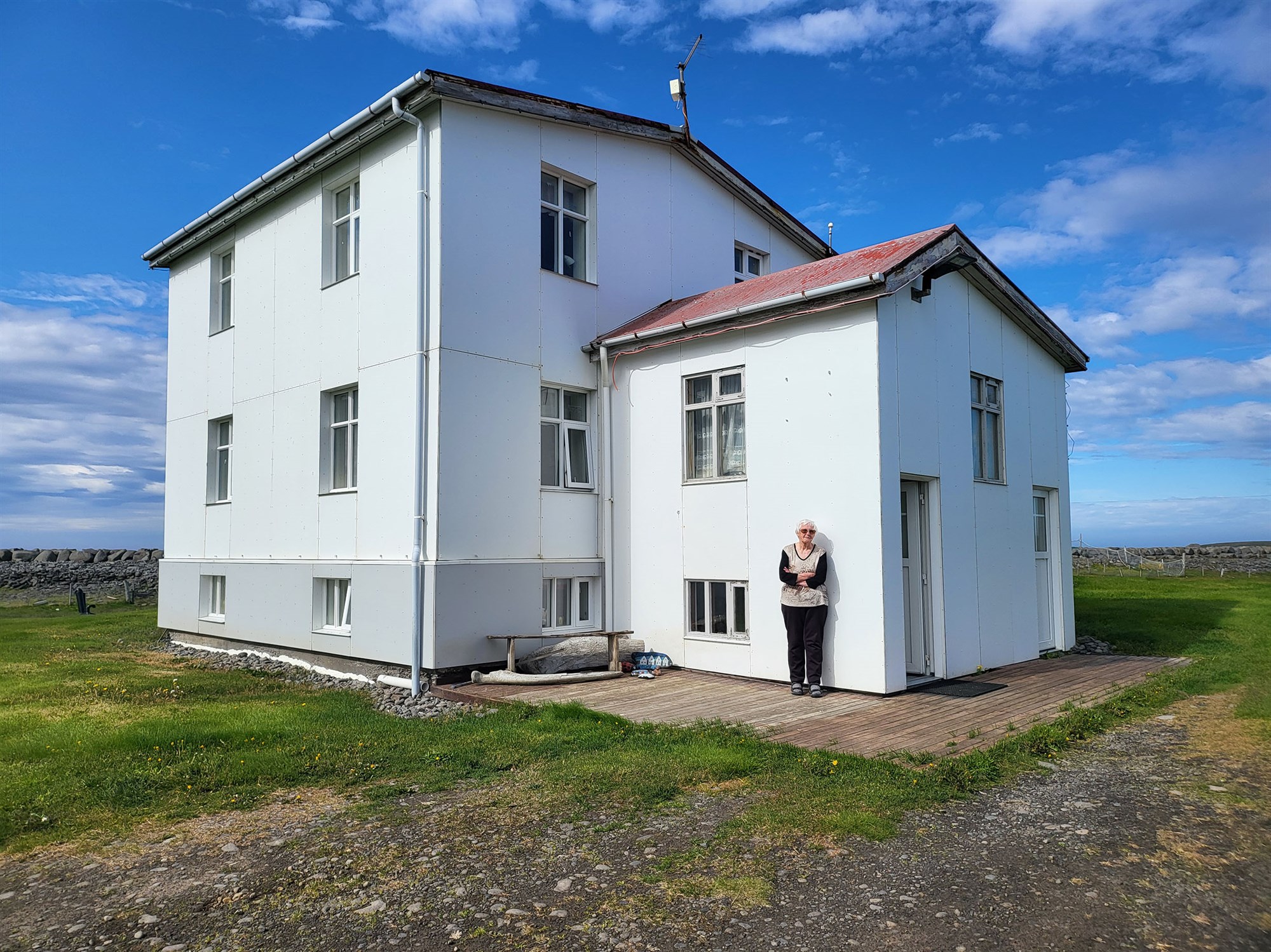 Rögnvaldur lést árið 2013 og býr því Guðlaug ein í elsta íbúðarhúsinu á Hrauni. „Ég er aldrei ein, hér er alltaf fullt af fólki, þessa heims og annars,“ segir hún kímin. Steinn er fæddur 1957 og Gunnar 1967 svo drengirnir koma á tíu árum. „Aldrei kom til greina að fara frá Hrauni, það eru forréttindi að fá að vera hér á þessum fallega stað. Við ferðuðumst aðeins saman hér innanlands en svo hef ég komið til Danmerkur, Skotlands og Kanada en við undum okkur vel hér heima. Ég nota bara símann þegar ég vil tala við vini og kunningja og svo erum við með saumaklúbb, konurnar í sveitinni,“ segir Guðlaug og bætir við að hún hafi alltaf verið frekar hraust. „Svo er ég aðeins að prjóna og sauma í kort.“