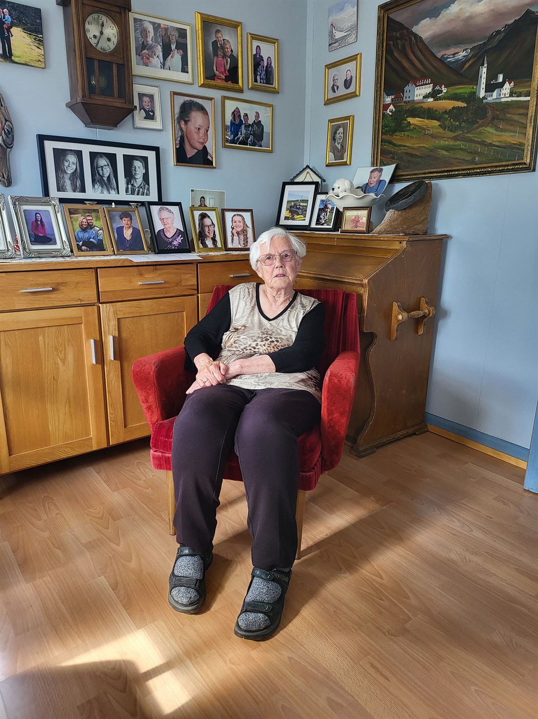 Það er stolt kona sem tyllir sér hér innan um myndir af afkomendum sínum. Guðlaug Jóhannsdóttir á Hrauni 1.
