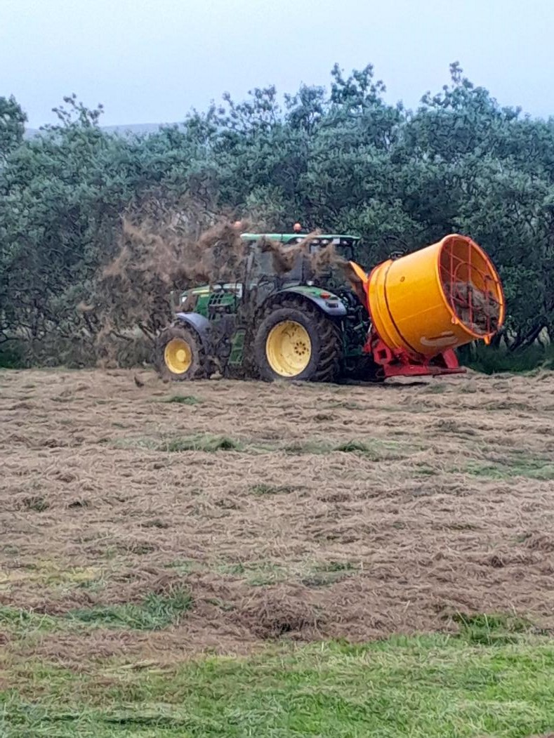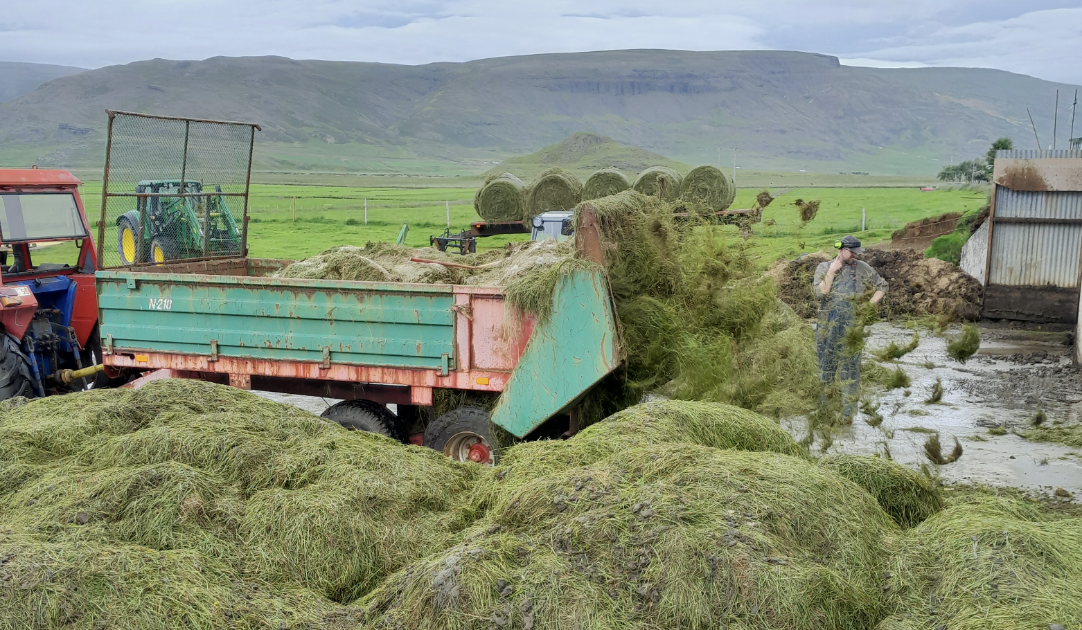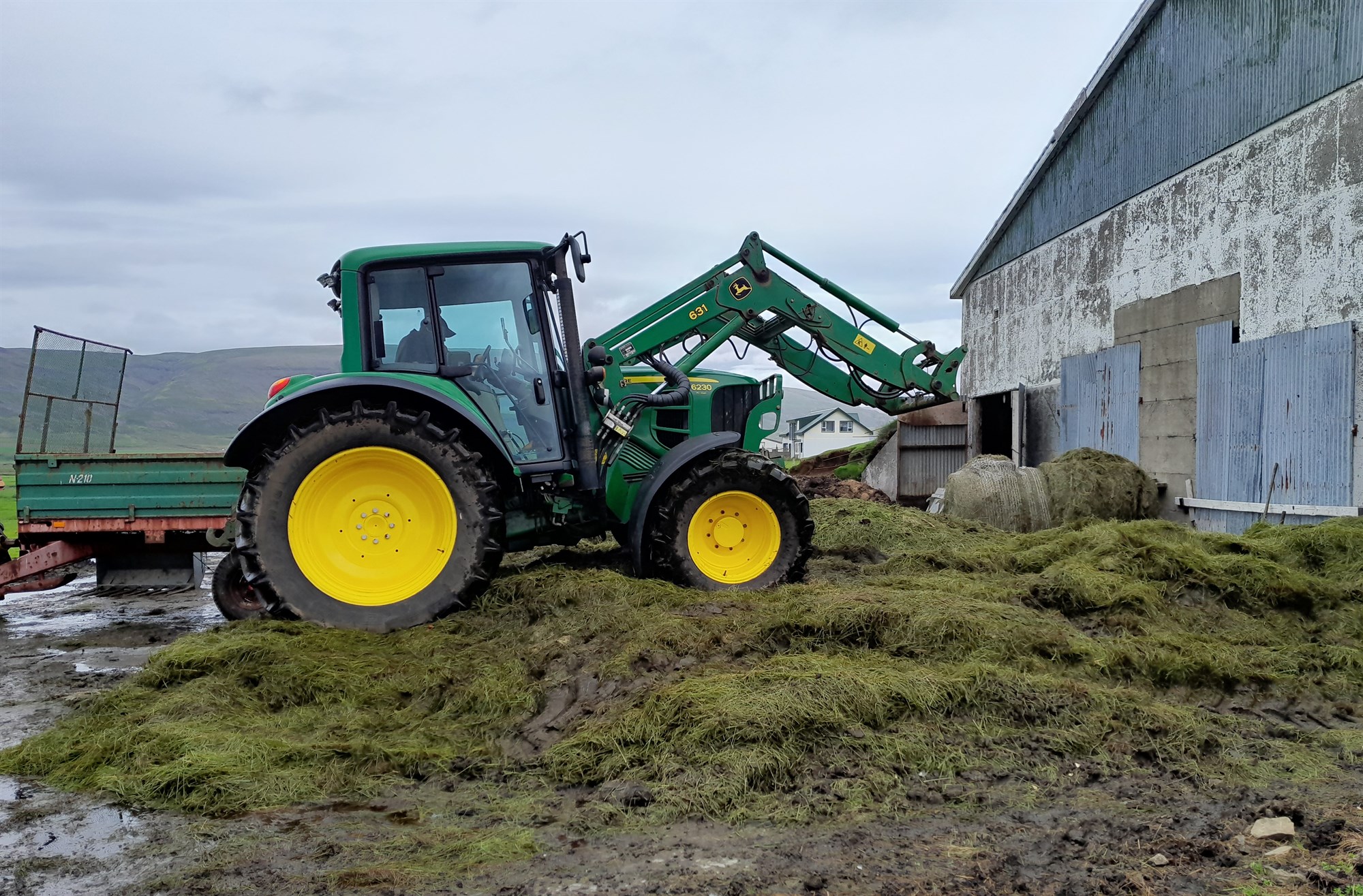 Búnaðarfélag Hvammsfjarðar á tunnu sem dreifir úr rúllum og við fengum hana lánaða og notuðum til að dreifa úr fyrningarúllunum, sem ekki nýttust fyrir búpeninginn, yfir slægjuna. Tættum allt saman og svo rúlluðum við þetta aftur og notuðum alla rúlluhnífana í vélinni til að saxa þetta eins fínt og hægt var, því okkur hafði verið tjáð að besti árangurinn næðist ef efnin væru söxuð í fimm til sjö sentímetra búta. Þannig fengjum við besta hráefnið fyrir hauginn og öll eftirvinnsla yrði auðveldari þegar kæmi að því að dreifa þessu á akrana.
