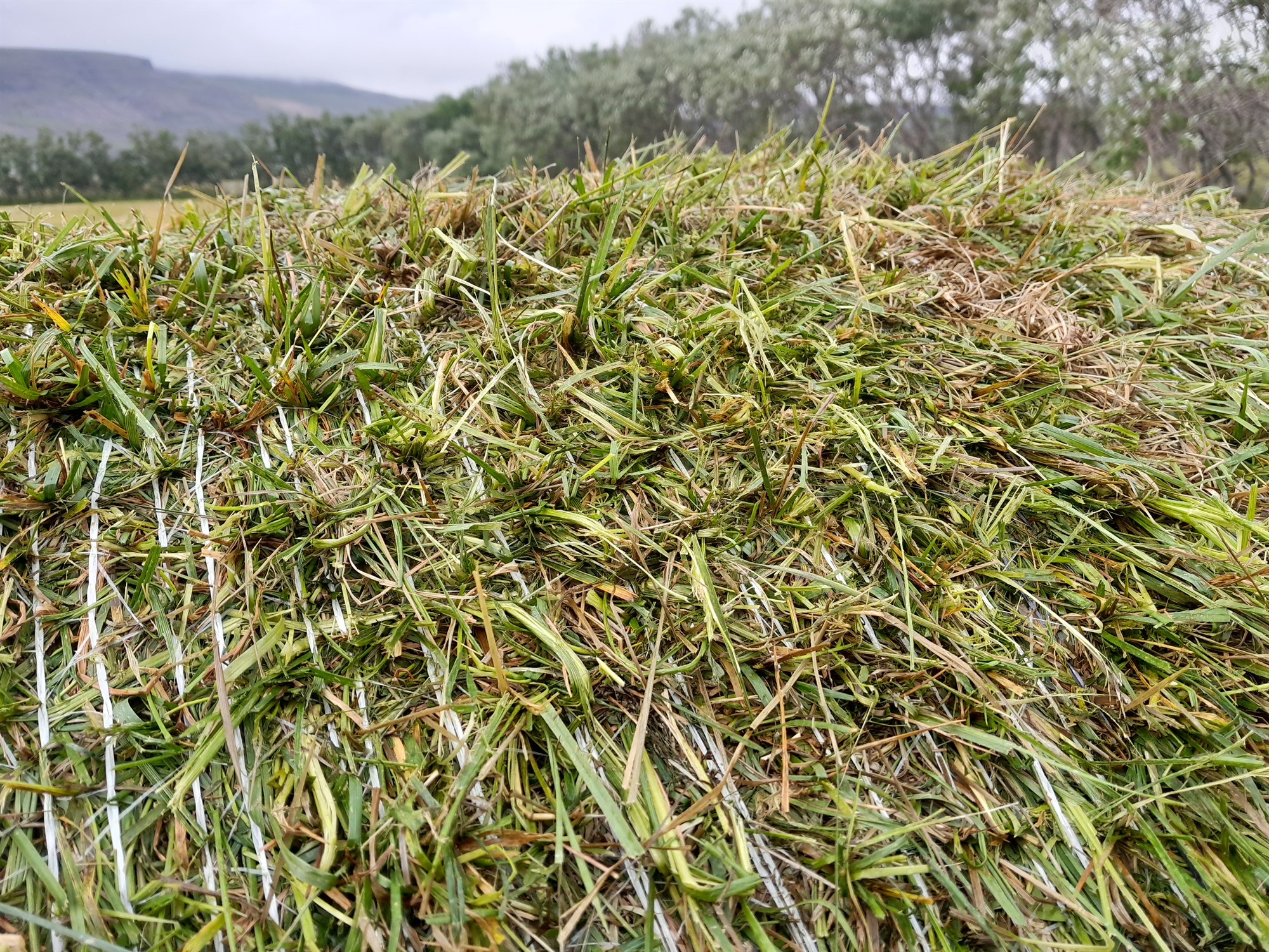 Nýslegið gras og fyrningar búnar að fara í gegnum söxun í rúlluvélinni.