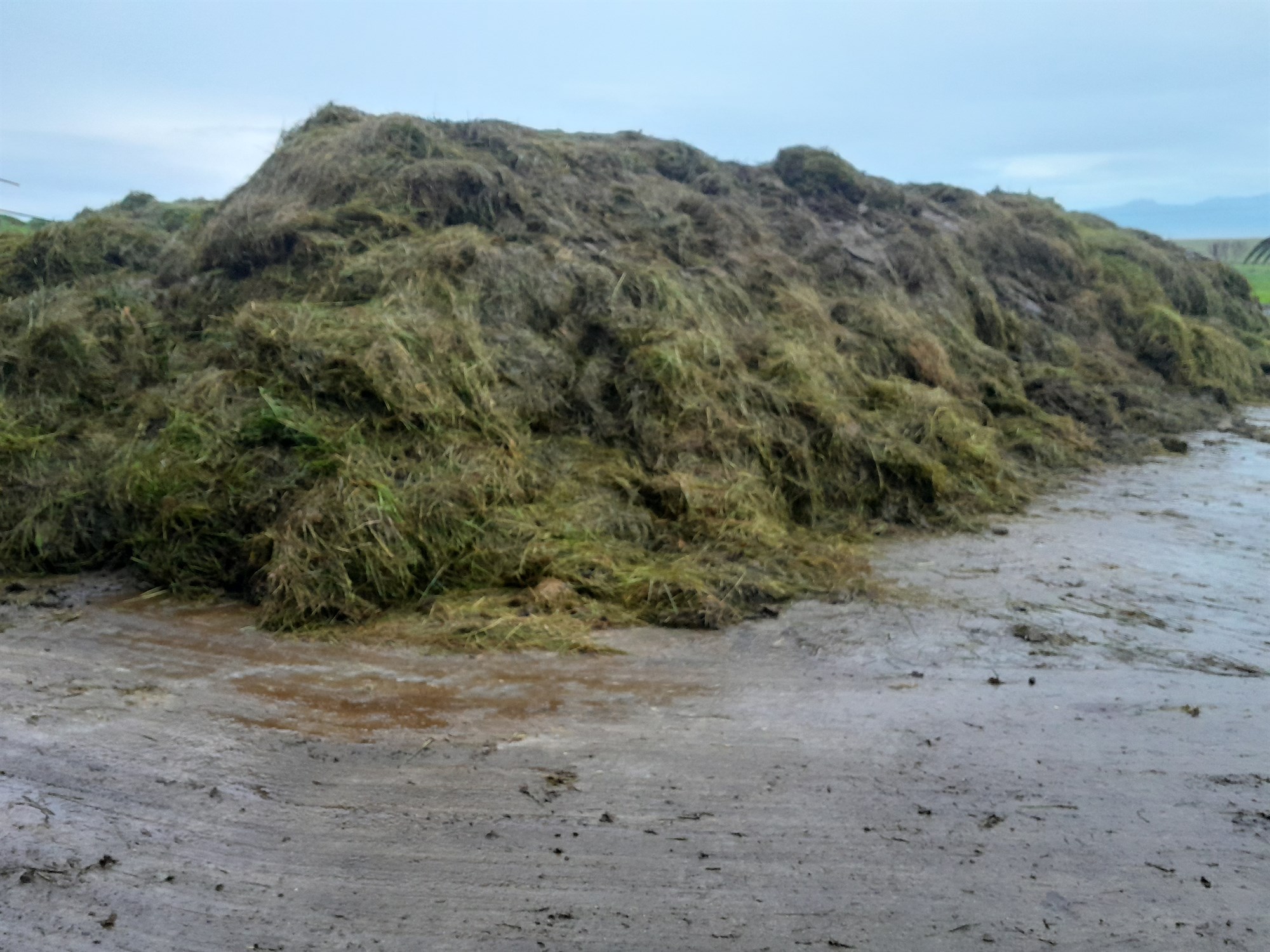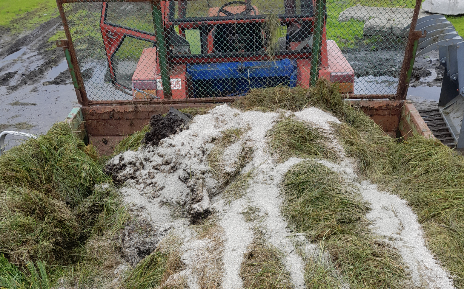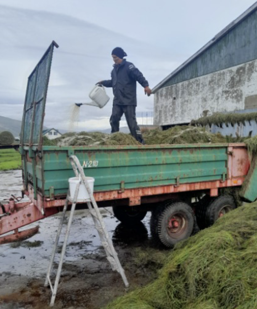 Næst skárum við þessar rúllur með rúlluskeranum og mokuðum þessu í taðdreifarann okkar. Saman við þetta settum við sauðatað og svo þessi íblöndunarefni; gerlana, kalkið og leirinn sem bindur þetta saman. Síðan var bara taðdreifarinn látinn snúast og þar með náðist góð blöndun. Efnið var svo sett á steypt plan, þjappað vel og þykkt plast sett yfir hauginn og annað hlífðarnet þar yfir – og svo allar hliðar vel huldar af sandi til að tryggja að ekkert loft kæmist inn,“ útskýrir Anna.