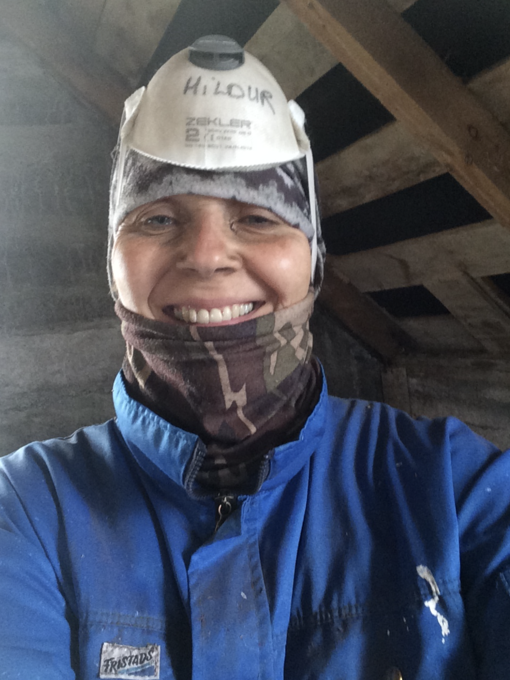 Vinna við að rífa gamalt er ekki alltaf snyrtileg, hér er Hildur eftir góðan vinnudag.