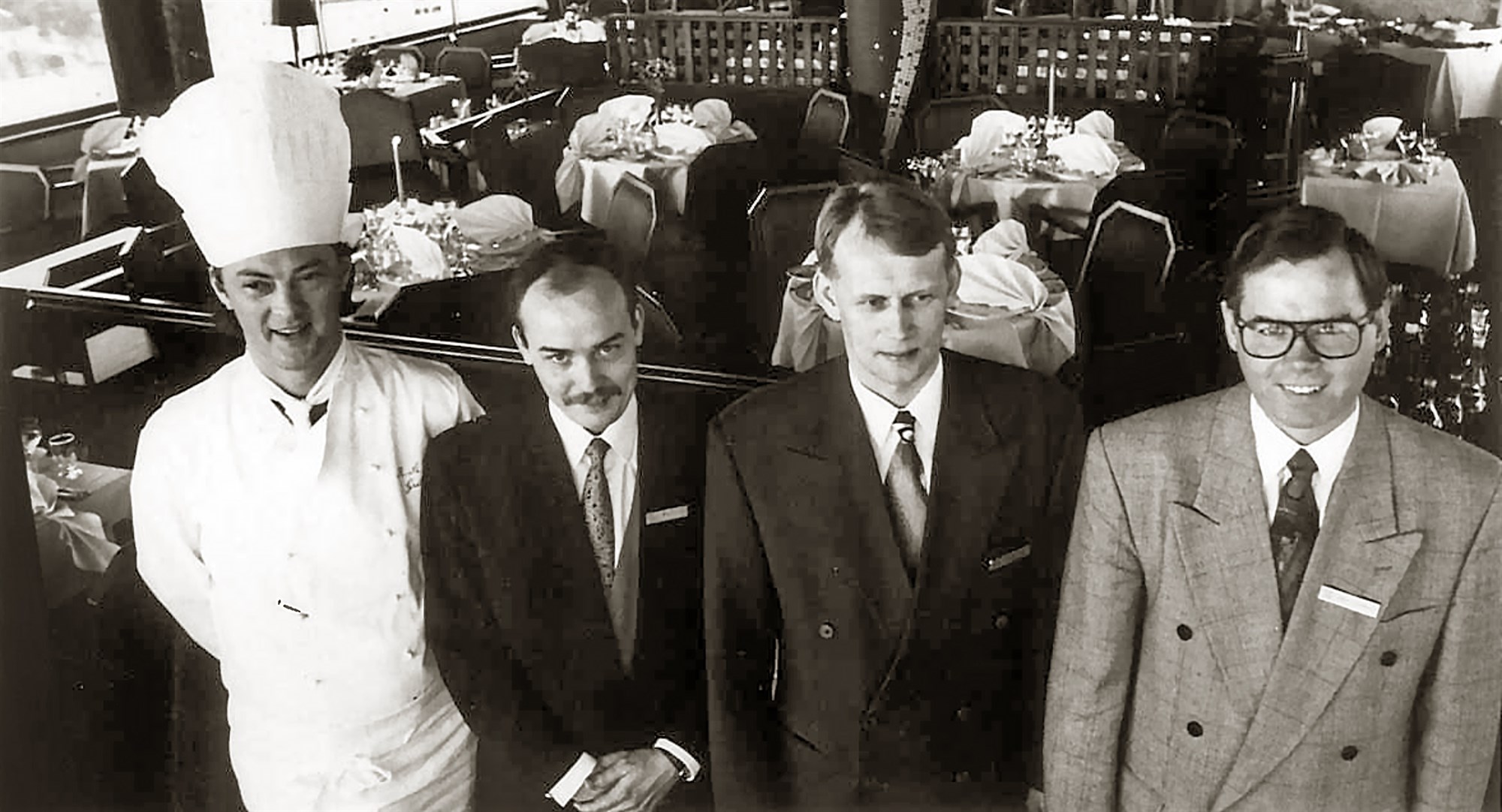 Ragnar Wessman matreiðslumeistari, Baldur Sæmundsson veitingastjóri, Sveinbjörn Friðjónsson, yfirmaður veitingasviðs, og Jónas Hvannberg aðstoðarhótelstjóri við vígslu breytinga á Grillinu á Hótel Sögu 1992. Mynd / Hótel Saga