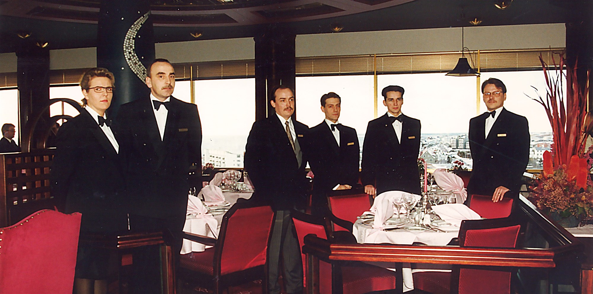 Við upphaf á einni af fínni veislunum sem haldin var í Grillinu fyrir franskt snyrtivörufyrirtæki eftir breytinguna á Grilllinu. Talið frá vinstri: Nanna Snorradóttir, Hörður Haraldsson, Baldur Sæmundsson veitingastjóri, Helgi Haraldsson, Kristján Nói Sæmundsson Hrafn Pálsson, framreiðslumenn í Grillinu. Mynd / Hótel Saga
