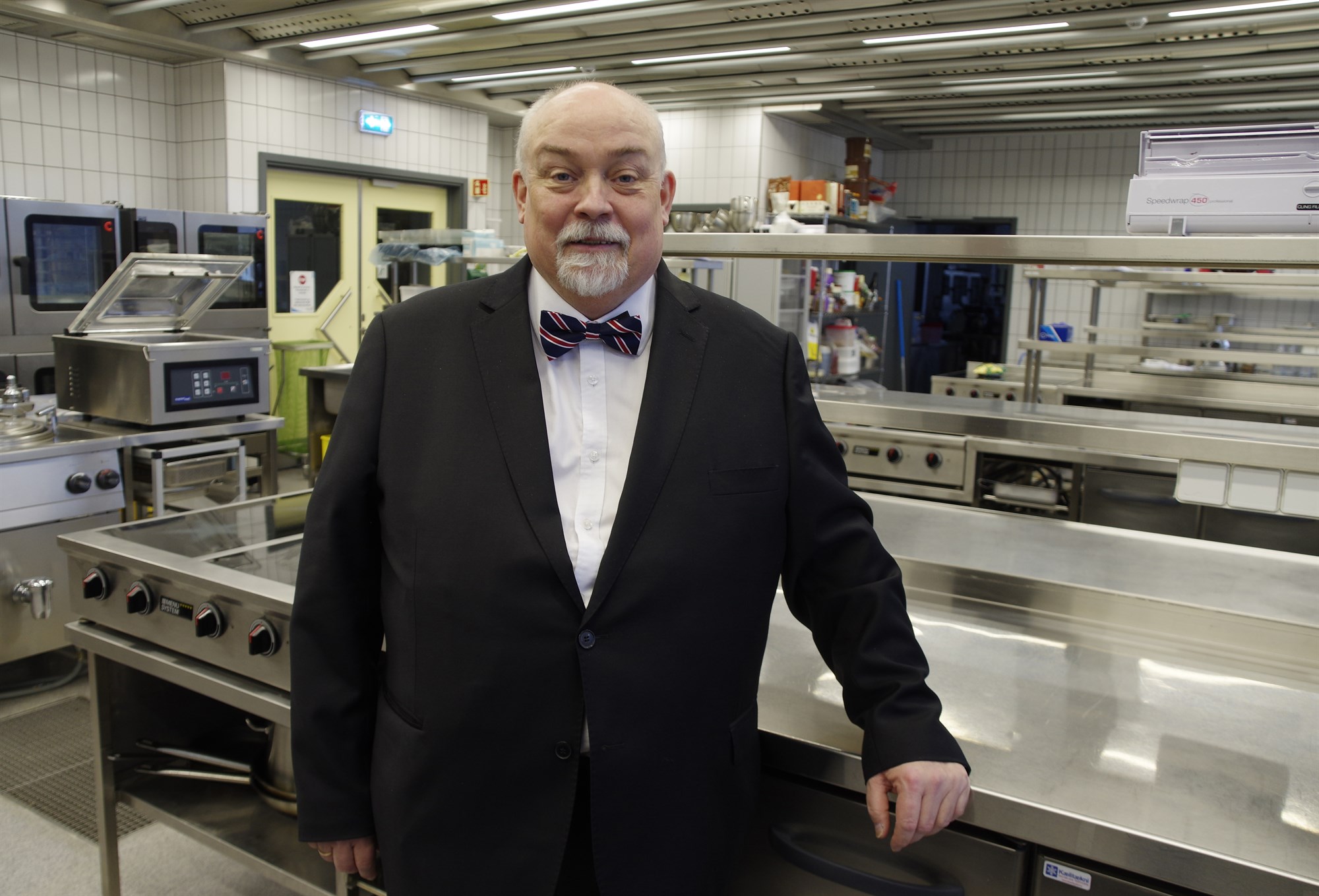 Baldur stoltur í kennslueldhúsi skólans og með slaufu í takt við tilefnið. Hann segir að við flutning matvælagreina sem sameinuðust undir nafni Hótel- og matvælaskólans og urðu deild í Mennatskólanum í Kópavogi hafi forsvarsmenn sýnt mikla framsýni í uppsetningu á fullkomnu kennslueldhúsi á fyrstu hæð byggingarinnar. Einnig með uppsetningu á fullkominni kjötvinnsluaðstöðu í kjallara hússins. Hefur þessi aðstaða síðan verið endurnýjuð í takt við tímann og stenst allar kröfur sem gerðar eru.