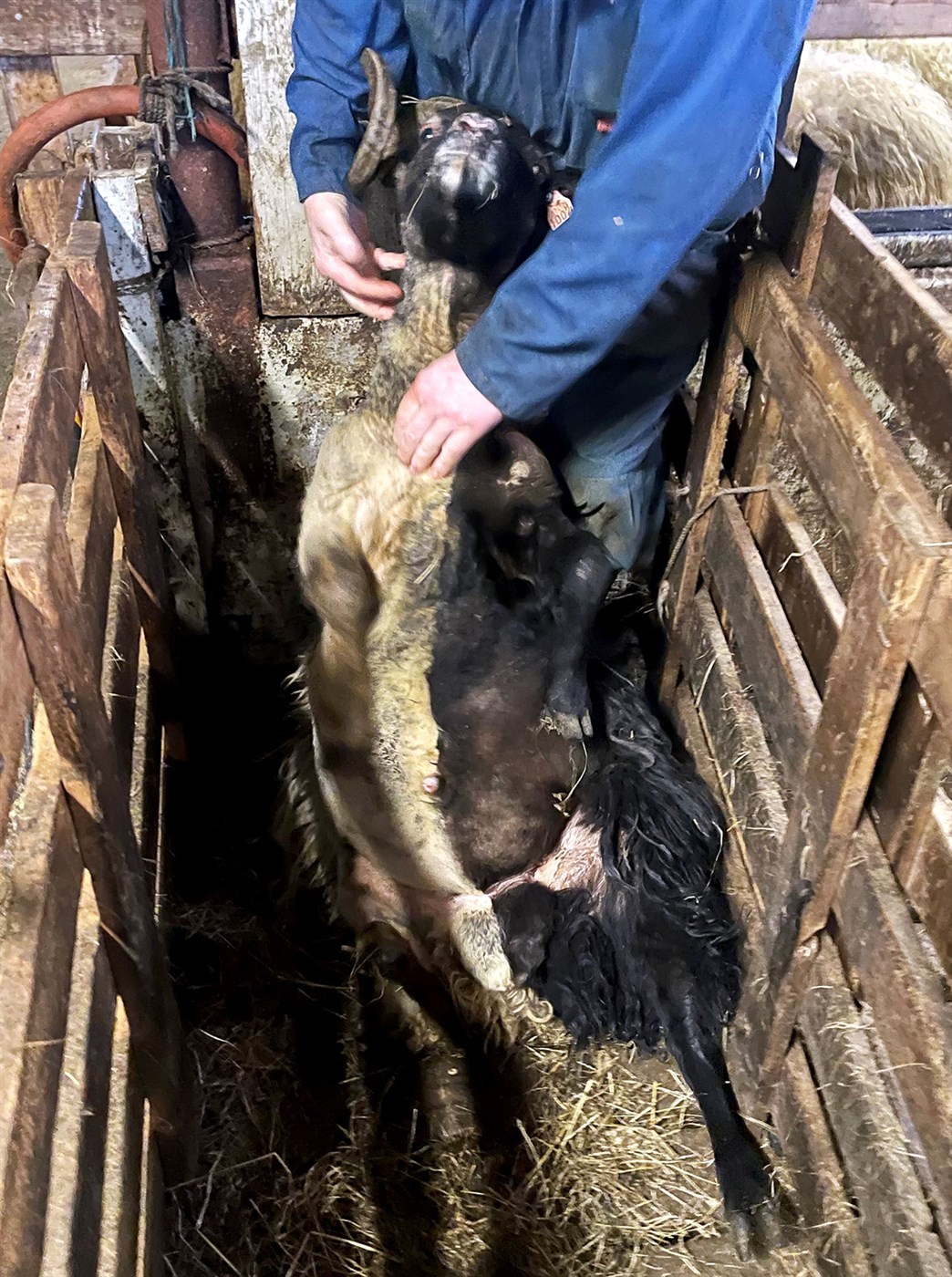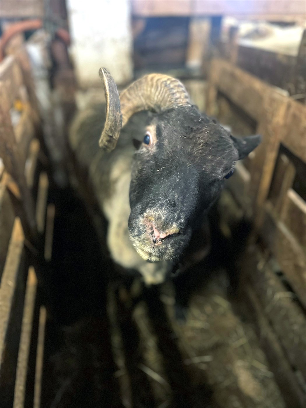 „Hann heitir Helmingur, fæddur 2021 og þykir stórmerkileg skepna,“ útskýrir hann. „Helmingur er tvískiptur á lit: grár öðrum megin og ljós hinum megin. Það er bara skorin rák eftir honum endilöngum, þú gætir skorið hann í tvo jafna hluta eftir litahelmingunum. Þetta er mjög sérstakt þó að þekkt séu einstök tilfelli þessa í heiminum. Hann er ekki fjárhrútur, nema bara settur á út af þessu, það koma ágætis lömb undan honum en þau voru bara svört og hvít.