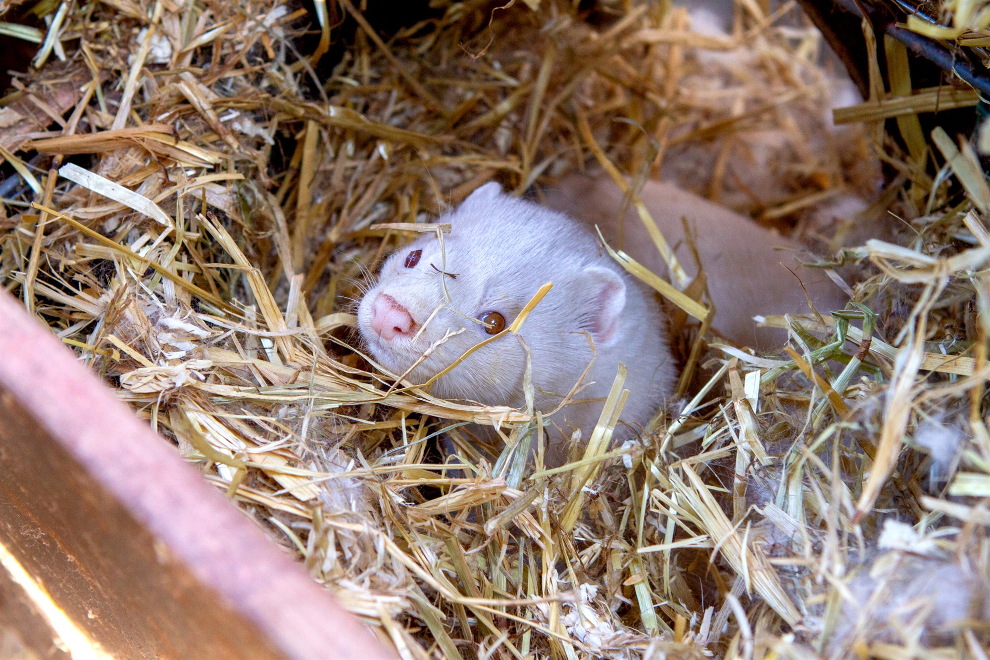 Minkarnir fá aðgang að hálmi til að gera þétt hreiður í búrin.