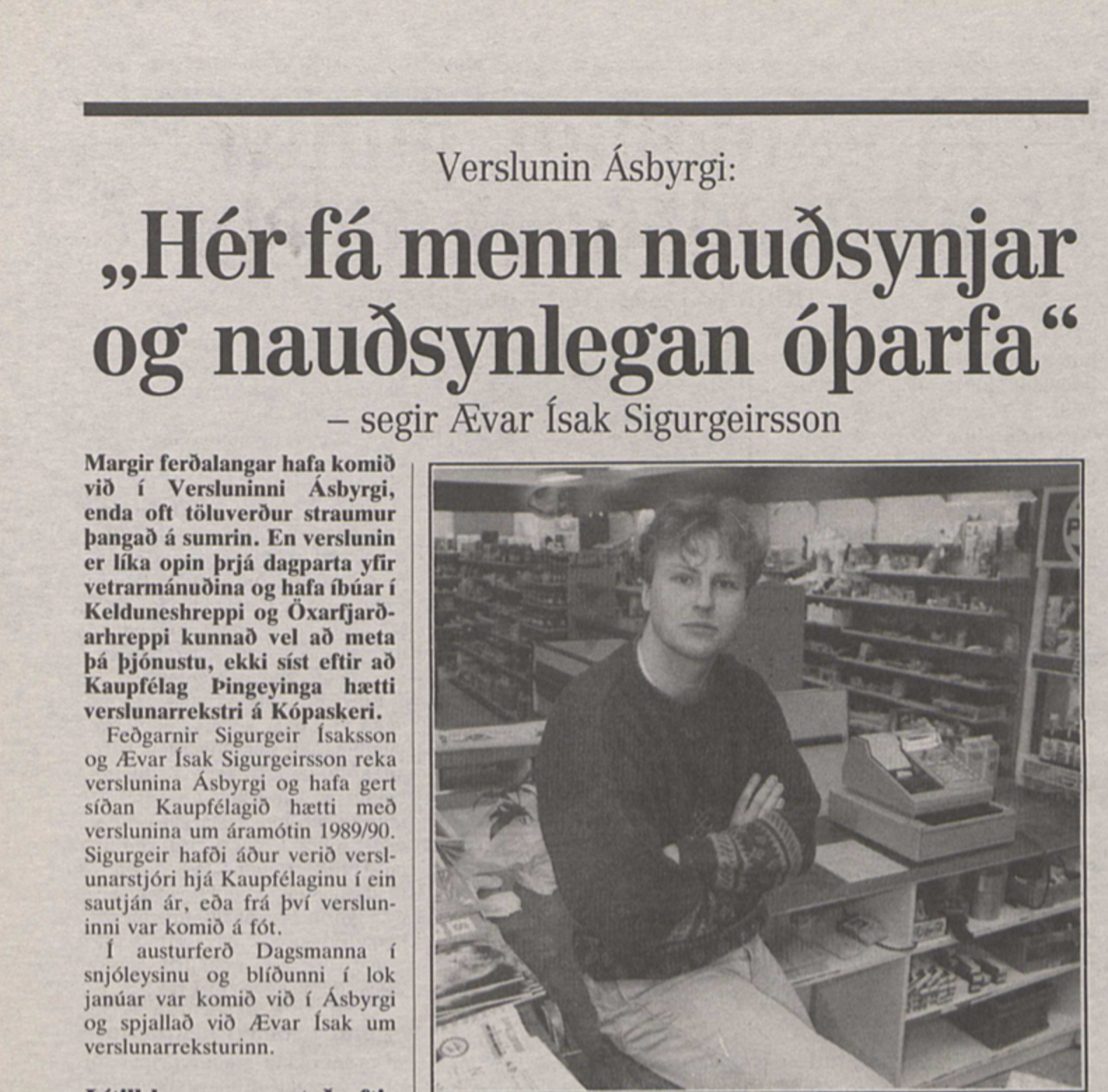 „Ég hringdi í pabba í sumar núna 25. júlí og sagði, er þetta ekki afmælisdagur búðarinnar? Jú, jú, svaraði pabbi, þú varst nú strákur þegar þú komst hérna inn í búðina í fyrsta skipti árið 1974, og þá var komin hálf öld! Ég hafði hringt á fimmtíu ára afmæli búðarinnar,“ segir Ísak glaðlega. Hann telur sig eiga einn lengsta starfsaldur á sama stað hérlendis, en segir frá því að upphaflega hafi Ásbyrgi opnað sem útibú frá Kaupfélagi N-Þingeyinga og haldist þannig í nokkur ár. „Við pabbi sammæltumst svo um að kaupa lagerinn og reksturinn og að ég myndi starfa þar í eitt ár. Þau urðu eitthvað fleiri. Ég labbaði inn í búðina á opnunardegi fyrir fimmtíu árum sérðu, hóf ferilinn með því að raða glerjum í kassa og er hér enn!“